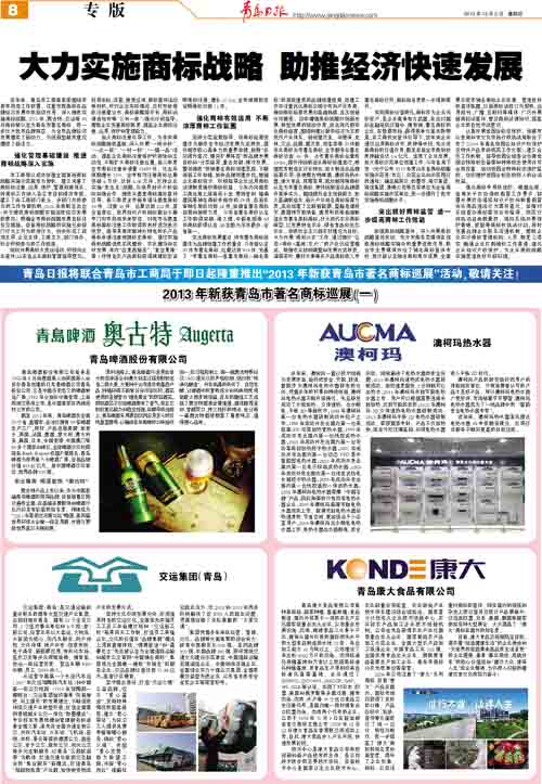 近年來(lái),青島市工商局緊緊圍繞市委市政府工作部署,注重發(fā)揮商標(biāo)在品牌經(jīng)濟(jì)發(fā)展中的驅(qū)動(dòng)作用,深入推進(jìn)實(shí)施商標(biāo)戰(zhàn)略,2013年,奧古特、交運(yùn)等90件商標(biāo)被認(rèn)定為青島市著名商標(biāo),進(jìn)一步壯大我市品牌陣容,為全市品牌經(jīng)濟(jì)發(fā)展增添了新動(dòng)力,為創(chuàng)新型城市建設(shè)增添了新活力