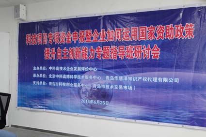 2014年6月26日,由中科高技術(shù)企業(yè)發(fā)展評(píng)價(jià)中心主辦,青島華慧澤知識(shí)產(chǎn)權(quán)代理有限公司、北京中科高博科學(xué)技術(shù)服務(wù)中心共同承辦的“科技項(xiàng)目專項(xiàng)資金申報(bào)暨企業(yè)如何運(yùn)用國(guó)家資助政策提升自主創(chuàng)新能力專題指導(dǎo)班研討會(huì)”在青島市技術(shù)交易市場(chǎng)成功舉辦。本次活動(dòng)面向青島市大中小科技型企業(yè)、科研院所、高校等單位,活動(dòng)圍繞“十二五”科技發(fā)展規(guī)劃提出的以提高自主創(chuàng)新能力為核心的戰(zhàn)略部署,幫助企業(yè)、科研院所、高校及時(shí)準(zhǔn)確的了解 “十二五”國(guó)家科技創(chuàng)新體系專項(xiàng)資金申報(bào)、獲取項(xiàng)目資金的程序進(jìn)行了解讀,科技項(xiàng)目資深評(píng)審專家對(duì)參會(huì)單位給予一對(duì)一指導(dǎo)對(duì)接。