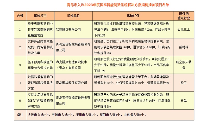 近日,工業(yè)和信息化部公示2023年度智能制造系統(tǒng)解決方案揭榜掛帥項(xiàng)目,全國(guó)共162個(gè)項(xiàng)目入選,我市軟控股份有限公司、海克斯康制造智能技術(shù)(青島)有限公司、青島寶佳智能裝備股份有限公司、青島鵬海軟件有限公司等4家企業(yè)的5個(gè)項(xiàng)目進(jìn)入公示名單(寶佳智能入選2個(gè)揭榜項(xiàng)目),入選數(shù)量居計(jì)劃單列市首位,全省第一。