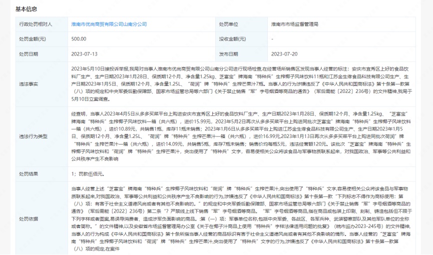 經查明,當事人2023年4月5日從多多買菜平臺上購進安慶市宜秀區(qū)上好的食飲料廠生產、生產日期2023年1月28日、保質期12個月、凈含量1,25kg、"藝富寶"牌海南“特種兵”生榨椰子風味飲料一箱(共六瓶),進價15.99元,2023年5月2日再次從多多買菜平臺上購進同批次“芝富寶”牌海南"特種兵”生榨椰子風味飲箱(共六瓶),進價10.89元,共銷售1瓶,庫存1瓶未銷售,2023年1月6日從多多買菜平臺上購進江蘇金生緣食品科技有限公司生產、生產日期2023年1月5日、保質期12個月、凈含量1.25L、"荷潤”牌“特種兵”生榨芒果汁一箱(共六瓶),進價16.99元,2023年1月13日再次從多多買菜平臺上購進同批次“荷潤”牌"特種兵”生榨芒果汁一箱(共六瓶),進價1409元,共銷售5瓶,庫存7瓶未銷售: 銷售價均每瓶5元,違法經營額120元、該批次“芝富寶”牌海查“特種兵”生榨椰子風味飲料和“荷潤”牌"特種兵”生榨世果汁,突出使用了"特種兵”文字,容易使相關公眾將該食品與軍事物質聯系起來,對我國政治、軍事等公共利益和公共秩序產生不良影響