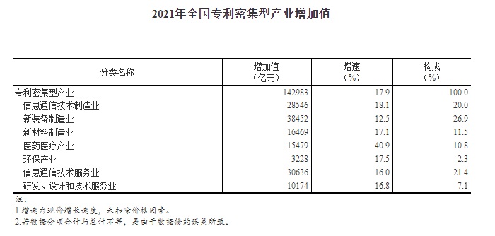 國家知識產(chǎn)權(quán)局、國家統(tǒng)計(jì)局發(fā)布數(shù)據(jù)顯示,經(jīng)核算,2021年全國專利密集型產(chǎn)業(yè)增加值為142983億元,比上年增長17.9%(未扣除價(jià)格因素,下同),比同期國內(nèi)生產(chǎn)總值(GDP)現(xiàn)價(jià)增速高4.5個(gè)百分點(diǎn);占GDP的比重為12.44%,比上年提高0.47個(gè)百分點(diǎn)。