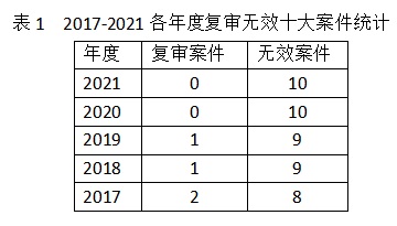 從復(fù)審關(guān)注度看,我們注意到近5年國家知識產(chǎn)權(quán)局發(fā)布的各年度專利復(fù)審無效十大案件,統(tǒng)計結(jié)果如表1所示。從整體上看復(fù)審案件的占比較少,特別是近兩年的復(fù)審案件均為0件,表明復(fù)審案件低于無效案件的關(guān)注度,也表明近兩年復(fù)審案件中出現(xiàn)的典型案例和指引較少。“2021年,共受理專利無效宣告請求7628件”,這與專利復(fù)審請求7.6萬件相比,在數(shù)量對比上僅為復(fù)審案件的十分之一。因此,專利復(fù)審仍然是專利復(fù)審和無效審理部的主要工作。