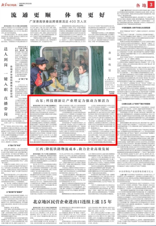 記者從山東省科技廳了解到,2024年山東企業(yè)研發(fā)投入占全社會(huì)研發(fā)投入比重達(dá)88.5%,山東省重大科技攻關(guān)項(xiàng)目90%以上由企業(yè)牽頭承擔(dān)。“企業(yè)已真正成為科技創(chuàng)新的‘出題人’‘答題人’‘閱卷人’。”山東省科技廳廳長孫海生說,山東整合建立18條標(biāo)志性產(chǎn)業(yè)鏈和66條重點(diǎn)產(chǎn)業(yè)鏈,為推動(dòng)科技創(chuàng)新與產(chǎn)業(yè)創(chuàng)新深度融合奠定堅(jiān)實(shí)基礎(chǔ)。