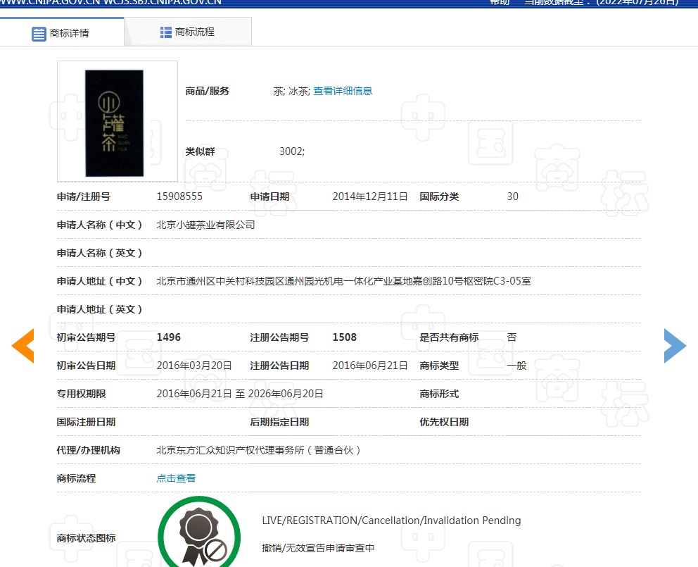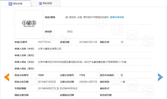 經(jīng)過(guò)查詢我們可以看到,“小罐茶”已經(jīng)成功注冊(cè)商標(biāo):