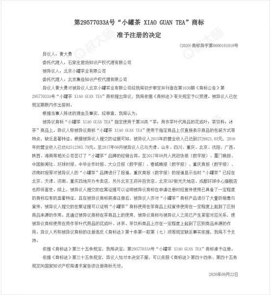 事實(shí)也正是如此,北京小罐茶業(yè)有限公司創(chuàng)立于2014年,創(chuàng)立初便嘗試申請(qǐng)注冊(cè)了以“小罐茶”為名的商標(biāo),但也確實(shí)因?yàn)樽?cè)產(chǎn)品類(lèi)別缺乏顯著性而被駁回,然后便開(kāi)始了無(wú)休止的駁回復(fù)審,期間北京小罐茶業(yè)有限公司也是確實(shí)將產(chǎn)品放在第一位,用心做好茶,并且也是收獲一致好評(píng)和媒體宣傳報(bào)道,一直持續(xù)到2018年重新提交注冊(cè)并且再次進(jìn)入駁回復(fù)審階段,通過(guò)提供公司經(jīng)營(yíng)創(chuàng)收產(chǎn)生的影響力,與多地多家公司簽訂合作合同,具有一定程度的大眾辨識(shí)度,加上媒體報(bào)道等相關(guān)證據(jù),終于在2020年九月份,商標(biāo)局正式準(zhǔn)予注冊(cè)!
