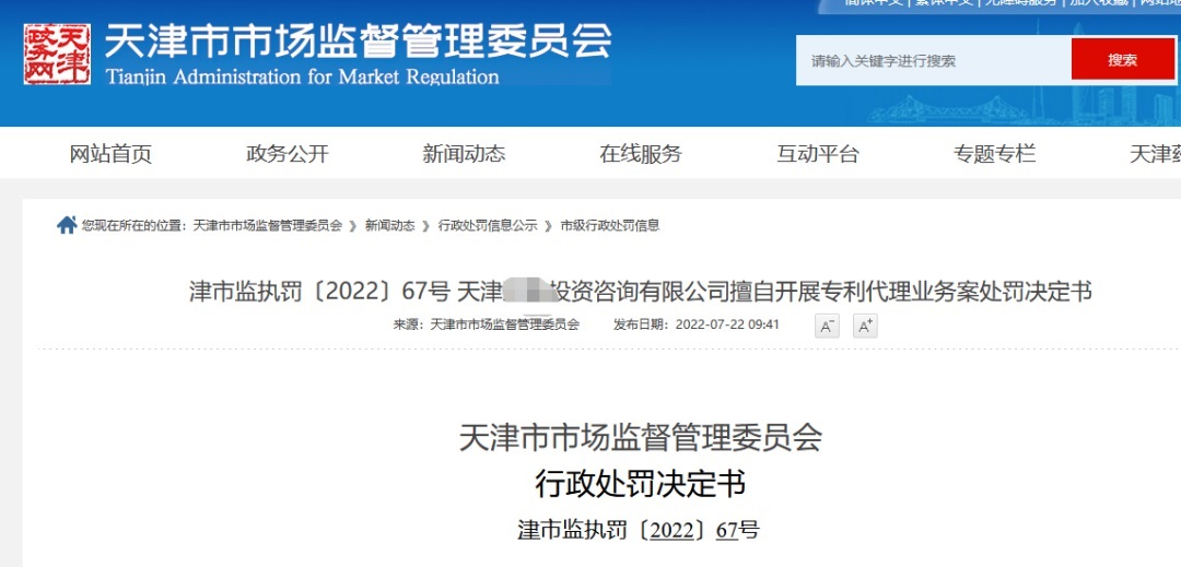 津市監(jiān)執(zhí)罰〔2022〕67號 天津XX投資咨詢有限公司擅自開展專利代理業(yè)務案處罰決定書