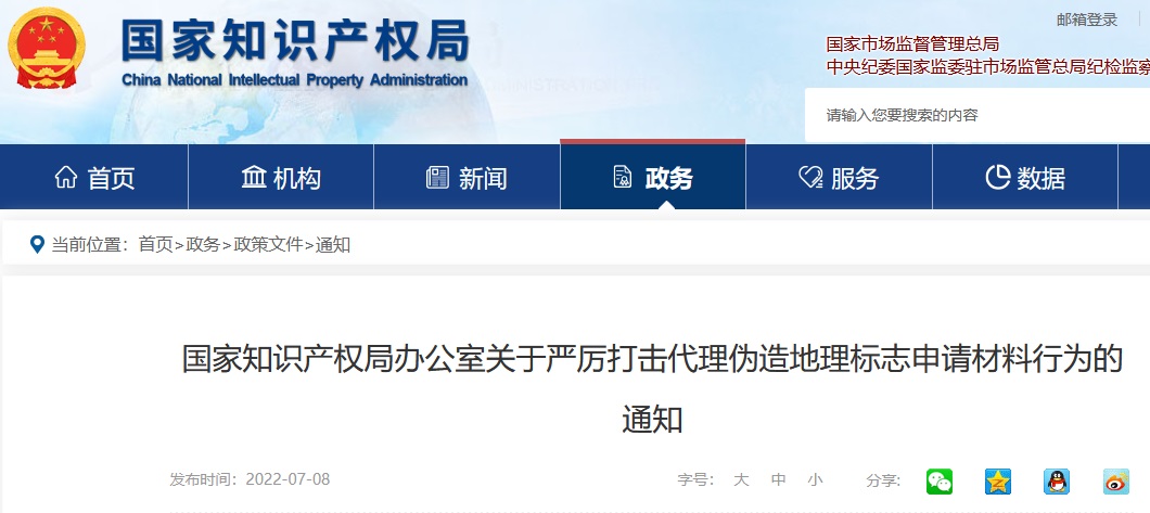 國家知識產(chǎn)權(quán)局辦公室關(guān)于嚴(yán)厲打擊代理偽造地理標(biāo)志申請材料行為的通知
