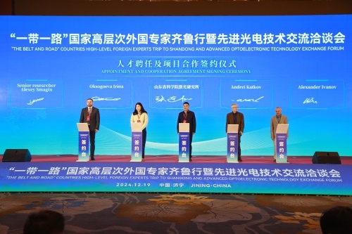 12月19日,“‘一帶一路’國家高層次外國專家齊魯行暨先進光電技術(shù)交流洽談會”在濟寧舉行?;顒右?ldquo;智聚孔孟之鄉(xiāng),科創(chuàng)賦能未來”為主題,由山東省科學技術(shù)廳、濟寧市人民政府、齊魯工業(yè)大學(山東省科學院)共同主辦。山東省科學技術(shù)廳黨組成員、副廳長于洪文,濟寧市政府黨組成員、副市長張東,齊魯工業(yè)大學(山東省科學院)黨委副書記劉玉出席活動并致辭。
