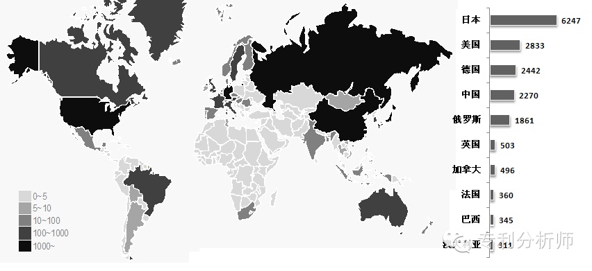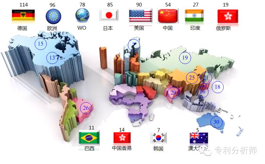 (1)國家區(qū)域分布。專利制度自誕生之日起就具有地域屬性。在專利的地域屬性中最突出的一項就是專利的地域分布,其表征了申請人專利布局的選擇和意向,也與申請人希望獲得專利保護的范圍密切相關。市場規(guī)模大、法律法規(guī)完善的地區(qū)往往是專利權人優(yōu)先布局的選擇。通過專利分析在不同國家的專利分布情況,可以掌握哪些國家或地區(qū)是專利的聚集區(qū),在企業(yè)進入相應國家或地區(qū)時,還要根據(jù)各國專利法規(guī)進行深入的專利分析。