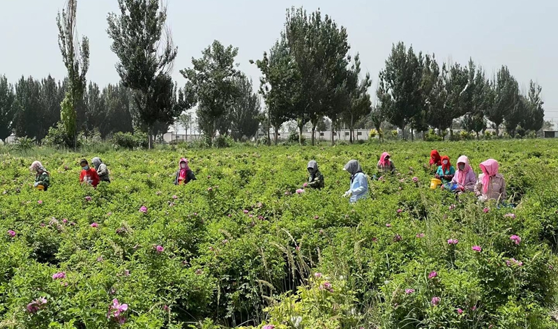 圖為寧夏嘉禾花語生態(tài)農(nóng)業(yè)合作社的農(nóng)戶在采摘玫瑰花蕾。 李珮 攝