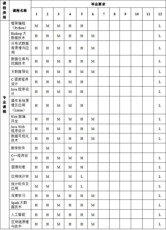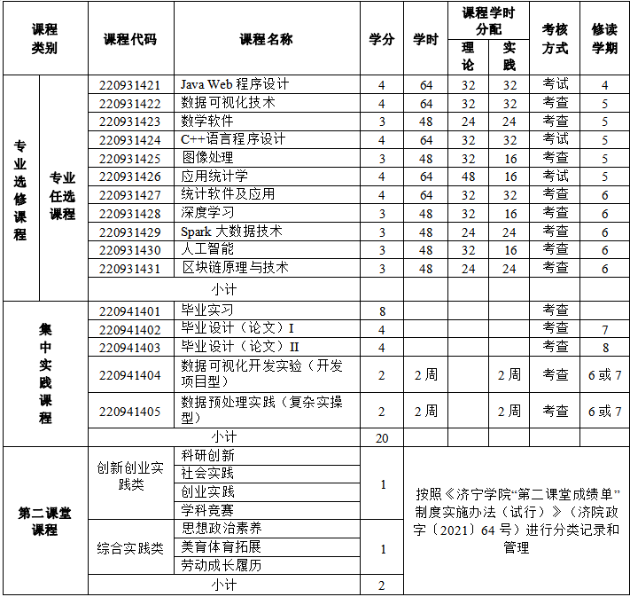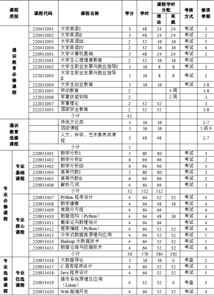 九、数据科学与大数据技术专业课程设置及学时分配表
