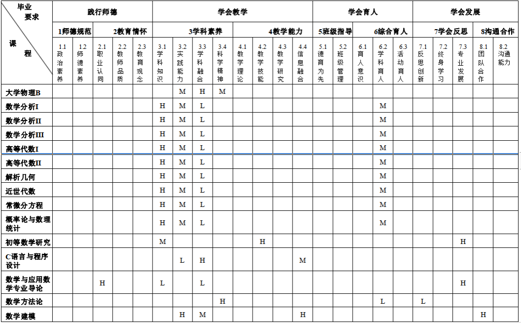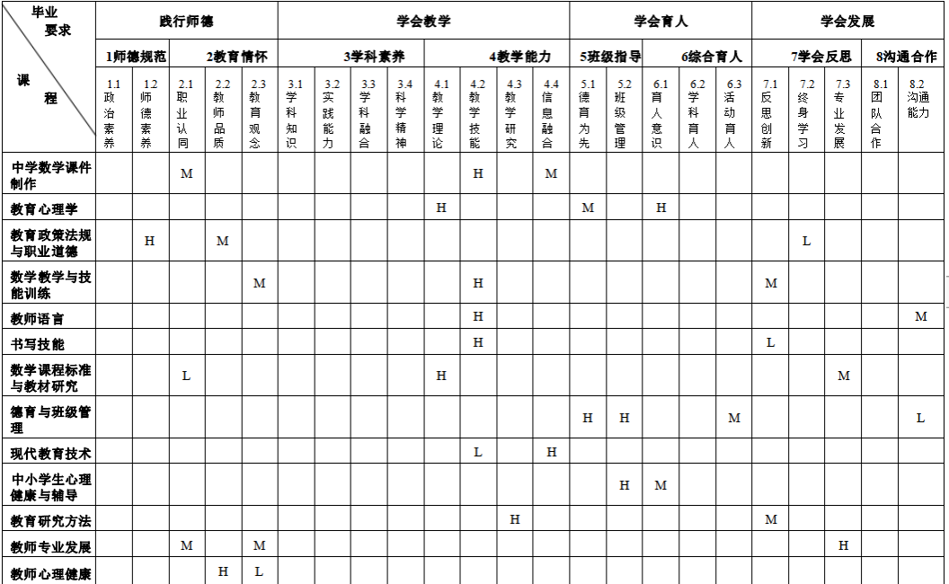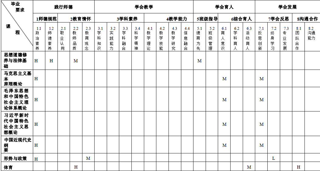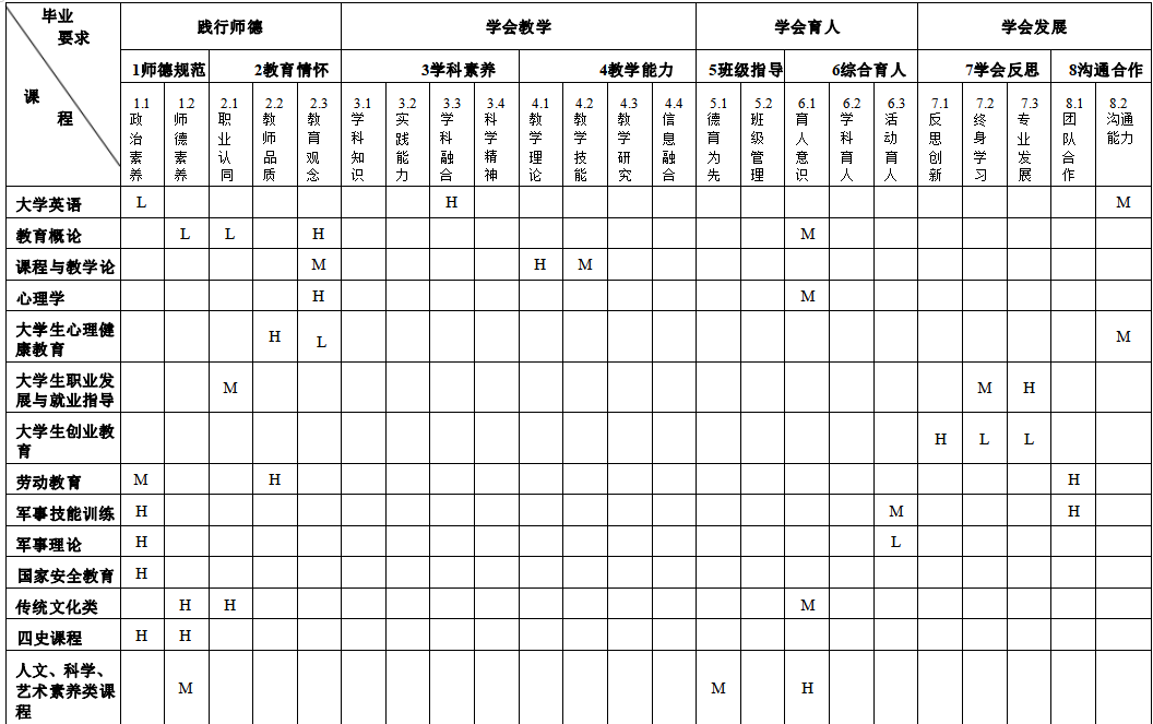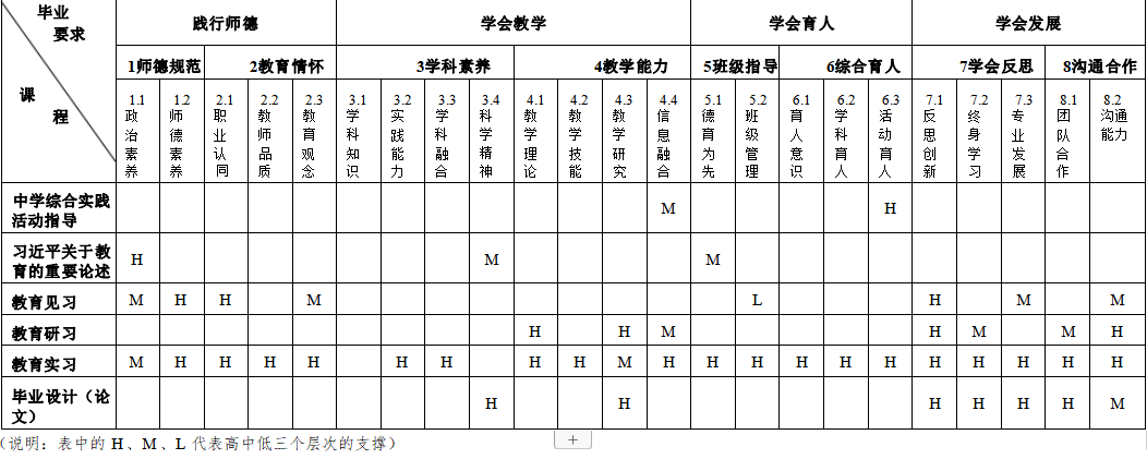 2.[教育情怀]热爱中学教育事业,具有积极的情感、端正的态度,深刻理解中学教育工作的意义,具有良好的职业认同。具有人文底蕴和科学精神,尊重学生人格,做学生锤炼品格、学习知识、创新思维、奉献祖国的引路人。具有健全的人格、良好的心理素质,具有健康的体魄和一定的军事基本理论及基本技能,达到国家规定的大学生体育锻炼合格标准和军事训练标准,养成锻炼身体的习惯。