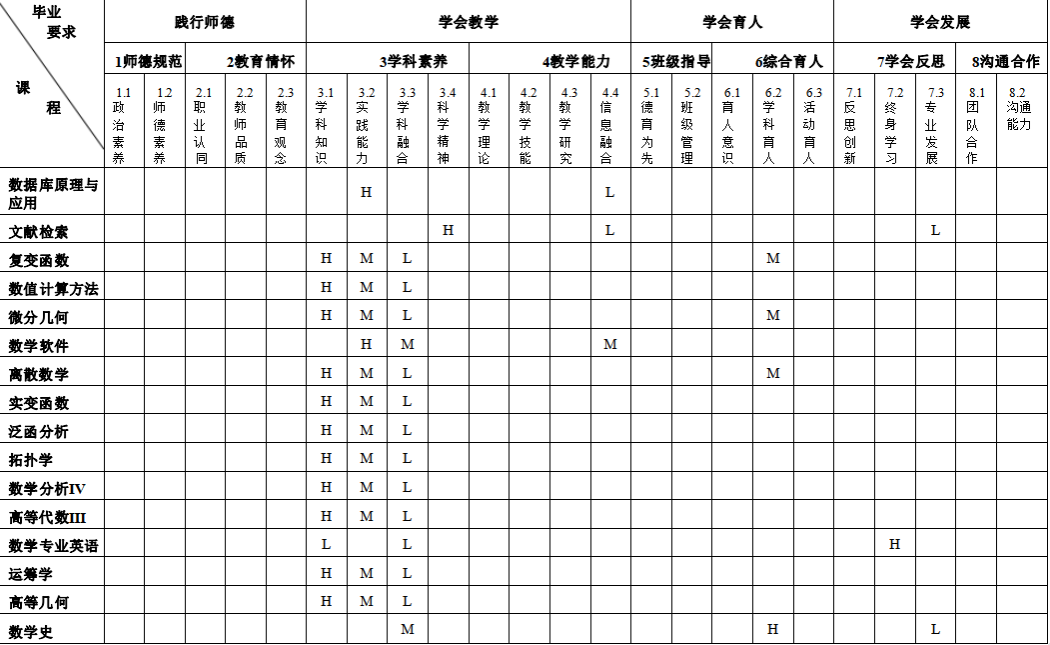 4.[教学能力]掌握教育学、心理学的基本原理,掌握中学数学课程标准,在教育实践中,能针对中学生身心发展和数学认知特点,运用数学教学知识和信息技术,进行教学设计、实施和评价,获得教学体验,具备教学基本技能,具有较强的教学能力和一定的教学研究能力。掌握计算机的基本知识,能熟练使用计算机及一些常用数学软件,具有较强的数学实验能力,以及编写应用程序的能力。