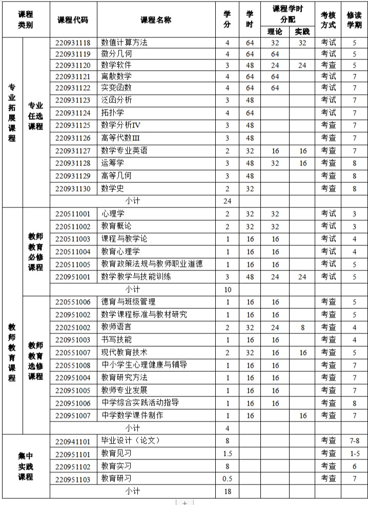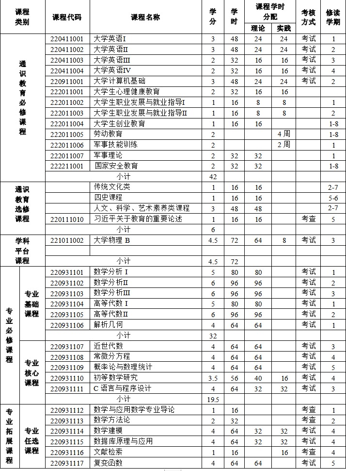 九、数学与应用数学(师范)专业课程设置及学时分配表