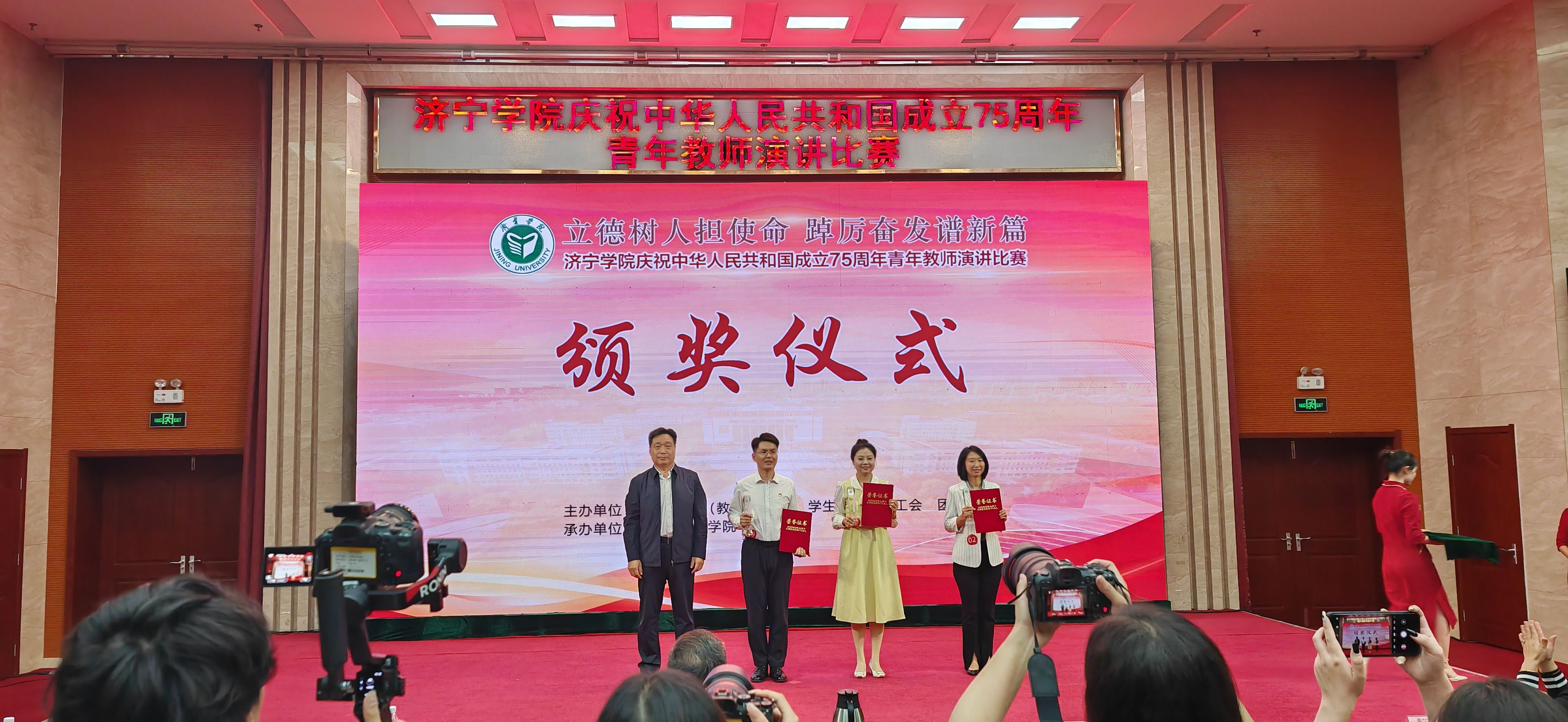 在决赛现场,两位老师凭借出色的表现、真挚的感情,围绕“庆祝中华人民共和国成立75周年”这一主题,结合自身的教育教学经验和工作特色,抒发了自己深耕教育的初心和使命,表达了自己的爱国情怀。最终闫卓敏凭借作品《红心向党志不渝深耕教育待花开》、张壮壮凭借作品《立德树人担使命争做新时代“大先生”》双双夺得一等奖。校长、党委副书记王清明亲自为两位老师颁奖。
