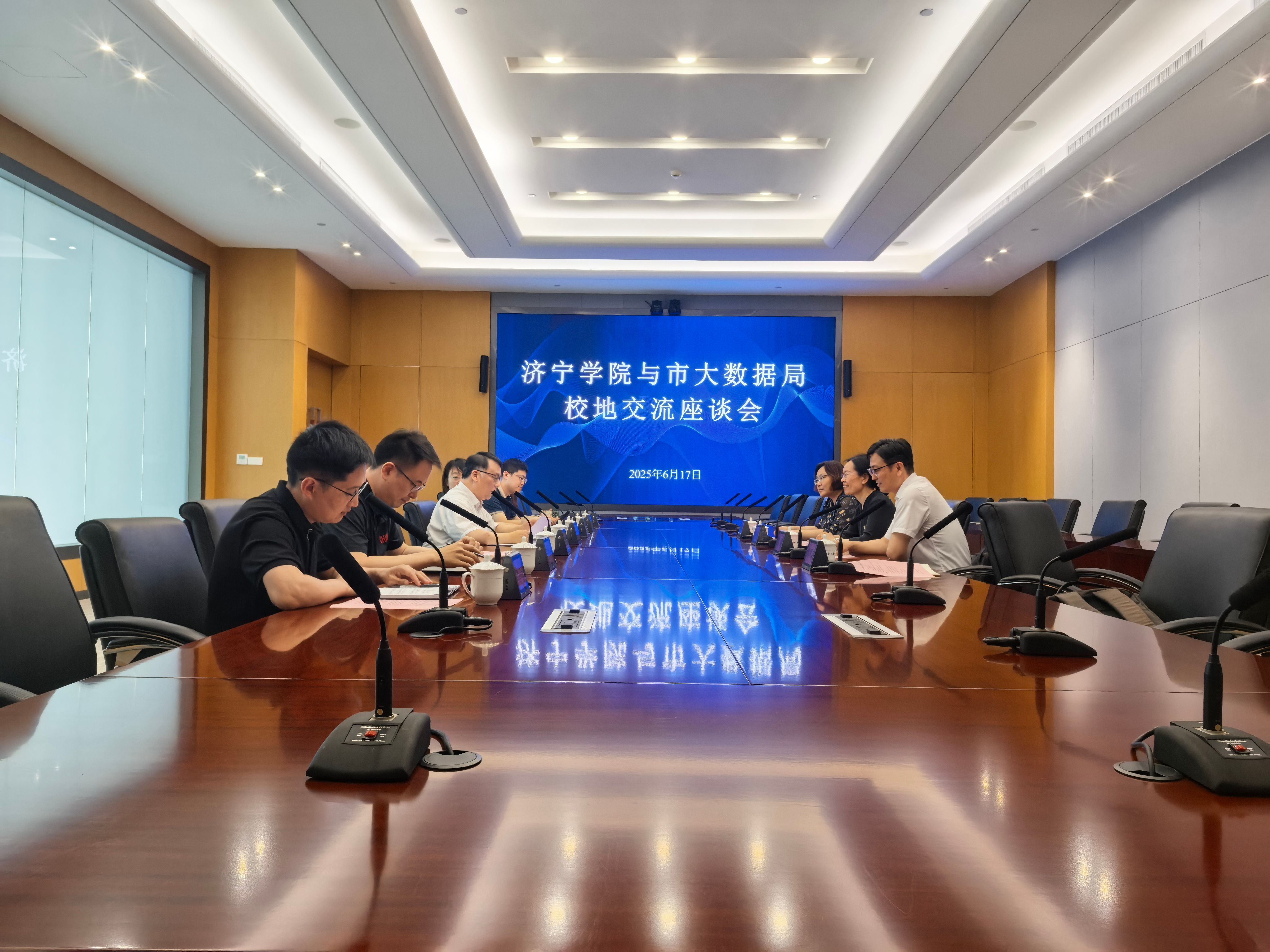 在济宁智慧城市运营中心,学院与市大数据局就数字人才培养展开深度交流。大数据局杜伟主任介绍了数据要素改革、数字乡村建设成果,并点明人才需求:亟需能突破技术瓶颈的高端人才,且人才需兼具机械、医药等行业知识与数据合规能力。黄长虹回应称,学院以“服务地方需求” 为宗旨,后续将推动师生 “走出去” 实践、“引进来” 课程,构建产学研闭环。