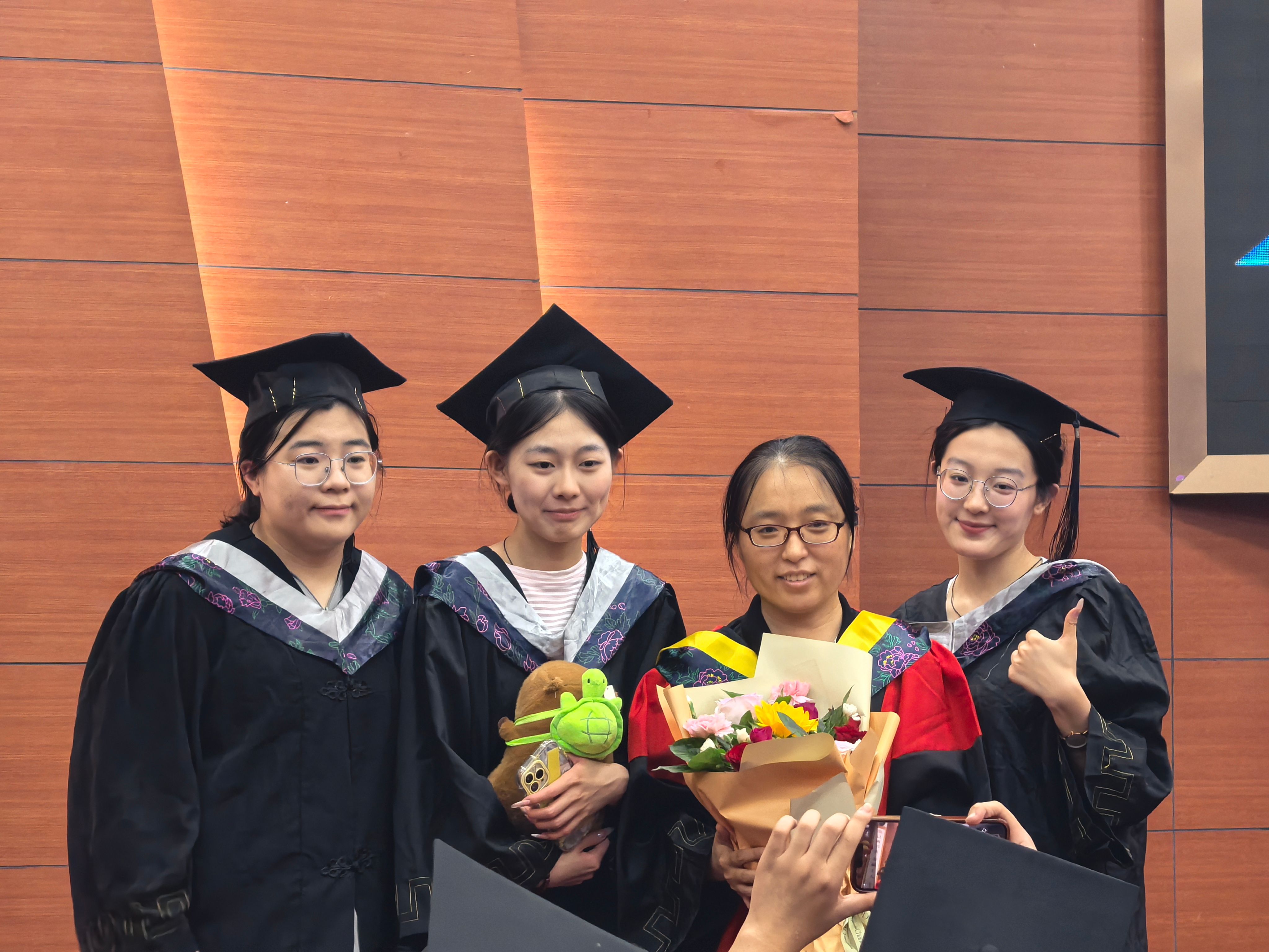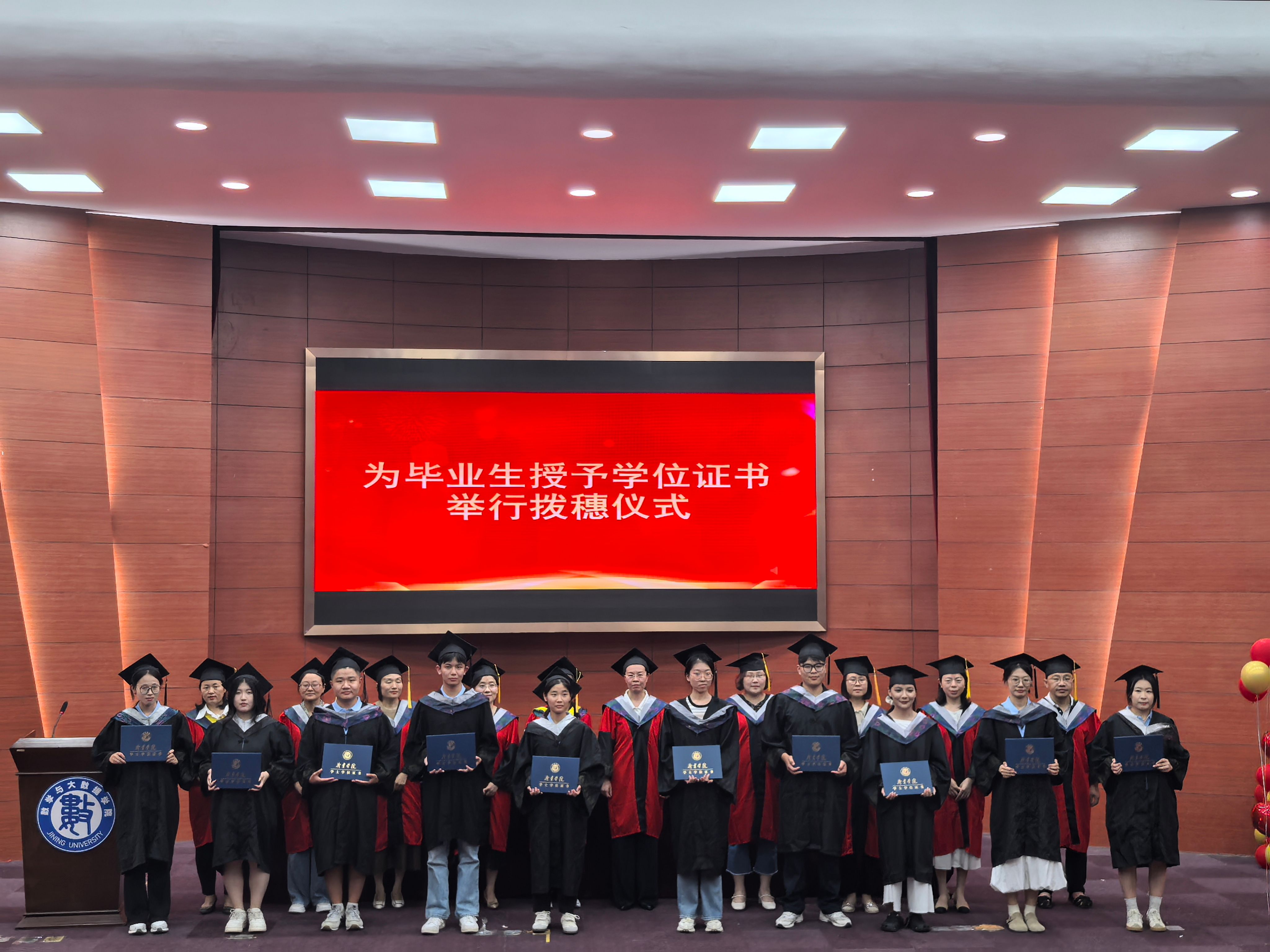 黄长虹、马小翠、王珍、申莹、王江峰、段玲玲、胡迎春、于乐源刘建美、丁纪玲共同为毕业生颁发学位证书并举行拨穗仪式。毕业生代表亦向导师们敬献花束,表达自己的感恩与不舍之情。