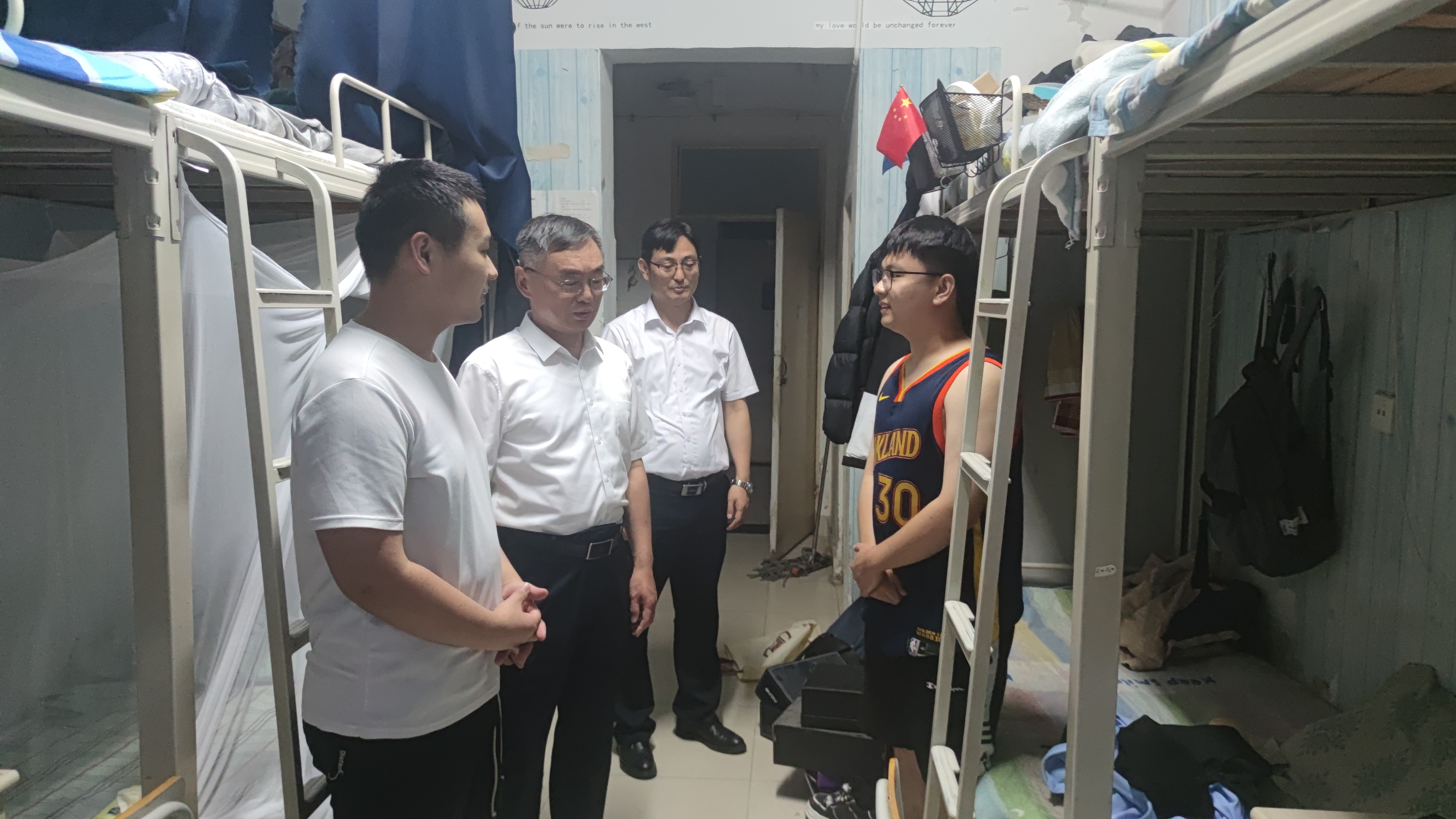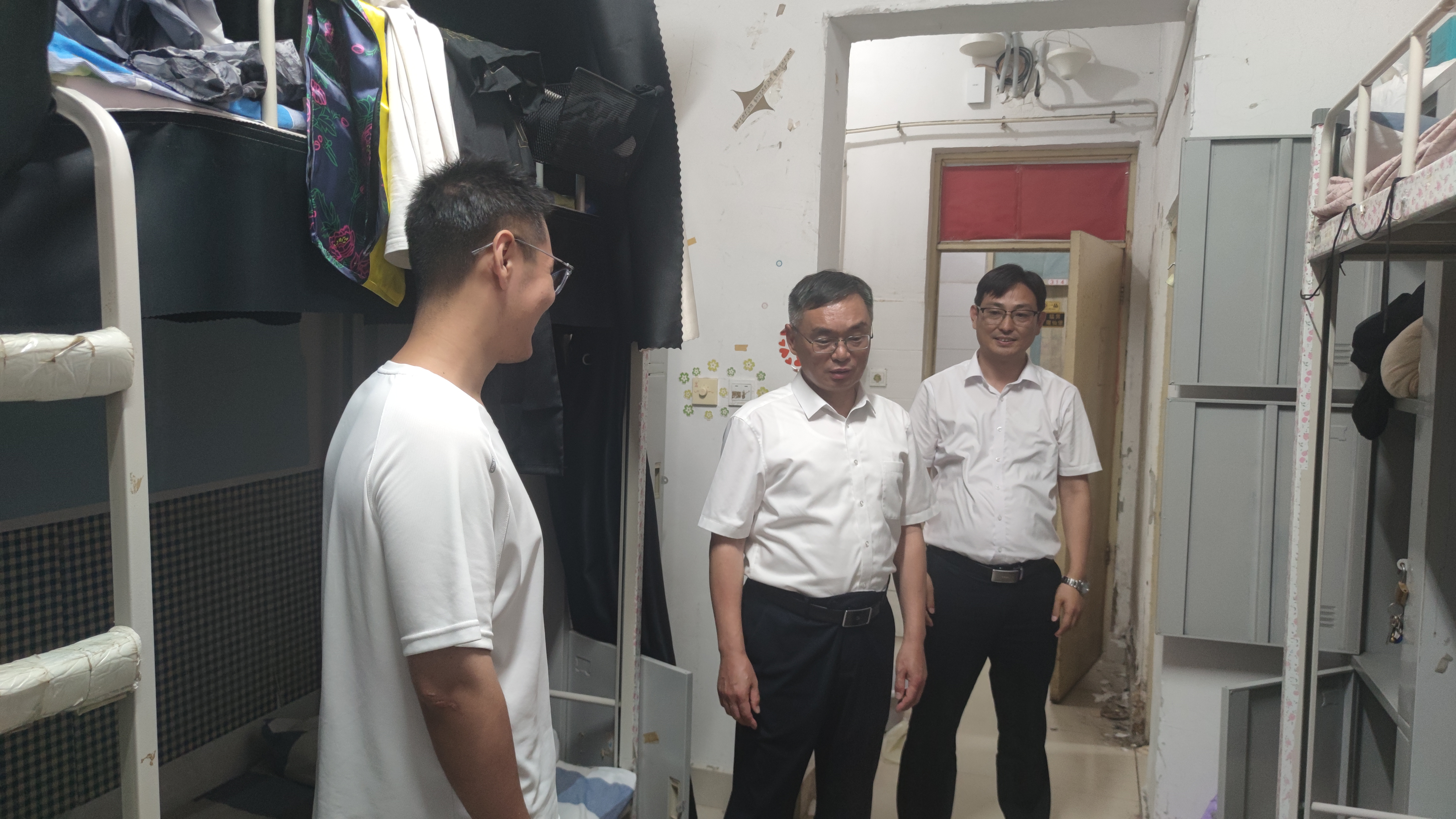 针对毕业学生,孙文和蒿鹏到宿舍进行看望,了解学生离校情况,叮嘱学生一定保管好毕业证书、学位证书,强调路上注意安全。