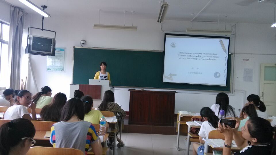 6月25日下午,我系王珍副教授作了题为《Monogamous property of generalized W states in three-qubit systems》的学术报告。 这次学术报告全校教师学生共90余人参加,气氛热烈活泼,受到师生好评。