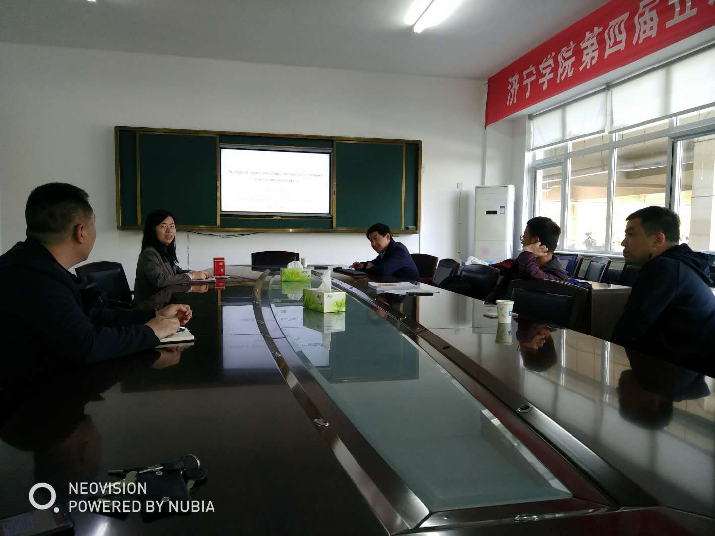 2019年4月17日下午2点,数学系在理科楼数学系会议室举办了题目“Stability of regime-switching processes under feedback controls and perturbations”的学术讲座。本次讲座由天津大学邵井海教授主讲。数学系主任王绍锋教授带领数学系部分教师参加了本次讲座。