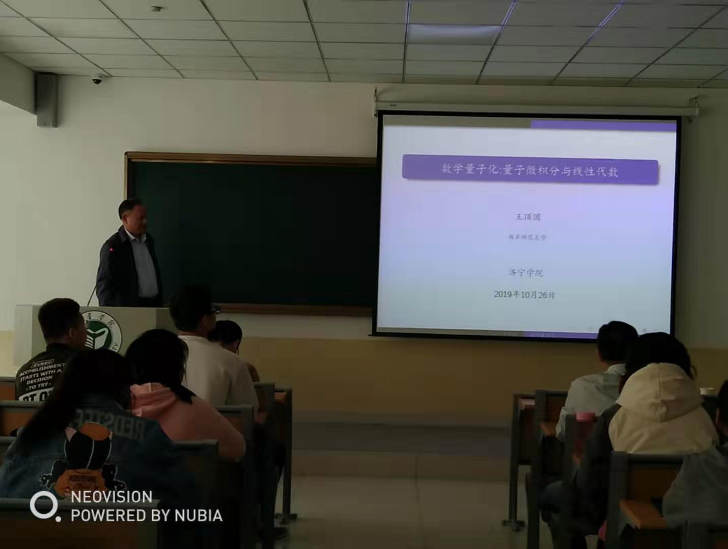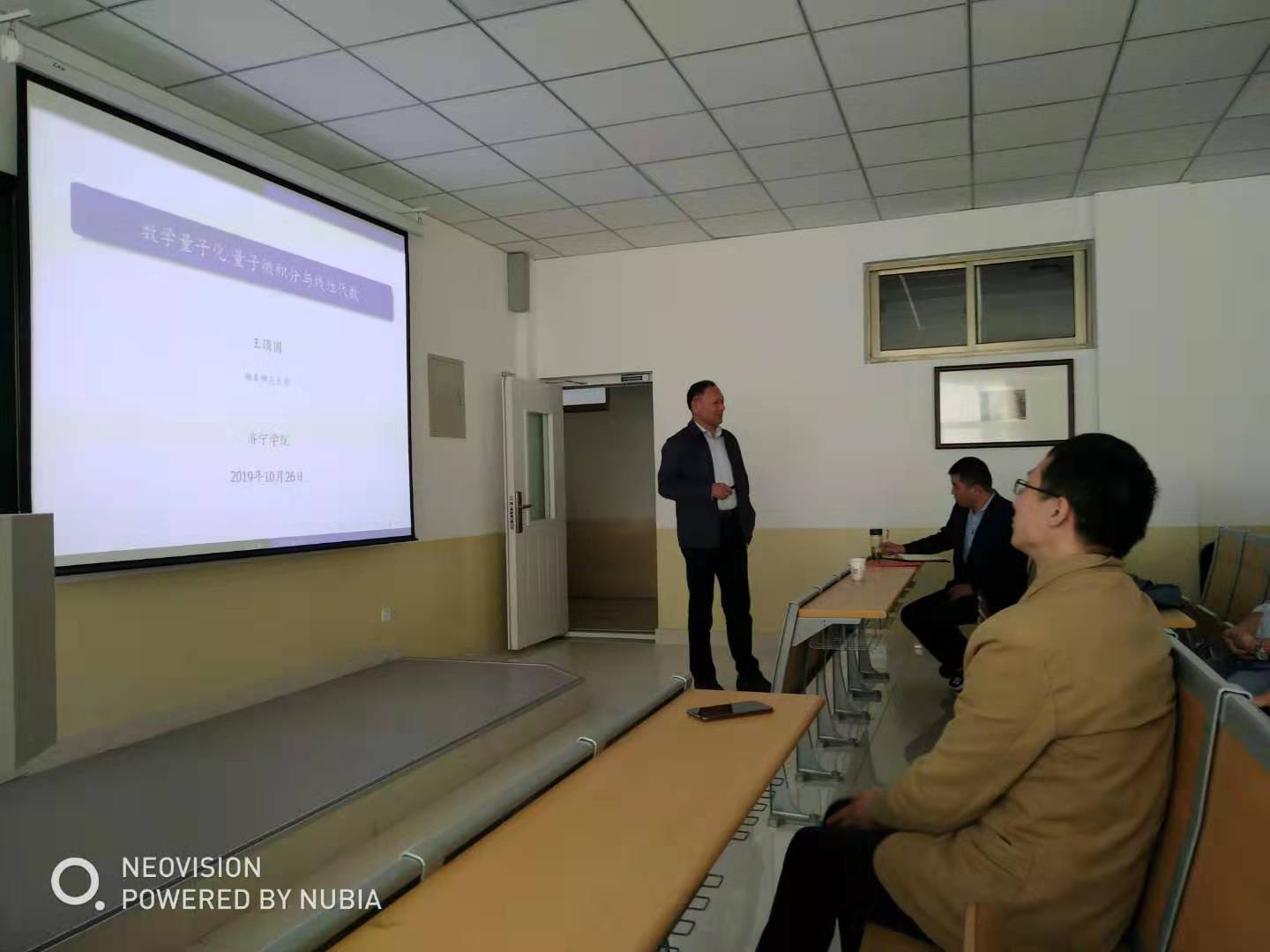 2019年10月26日下午16点,数学系在理科楼A305教室举办了主题为“数学量子化——量子微积分与量子线性代数”的讲座。本次讲座由曲阜师范大学博士生导师王顶国教授主讲。数学系副主任刘军教授,王江峰、鹿道伟副教授等数学系教师以及数学系2015级数学与应用数学专业全体同学参加了本次讲座。