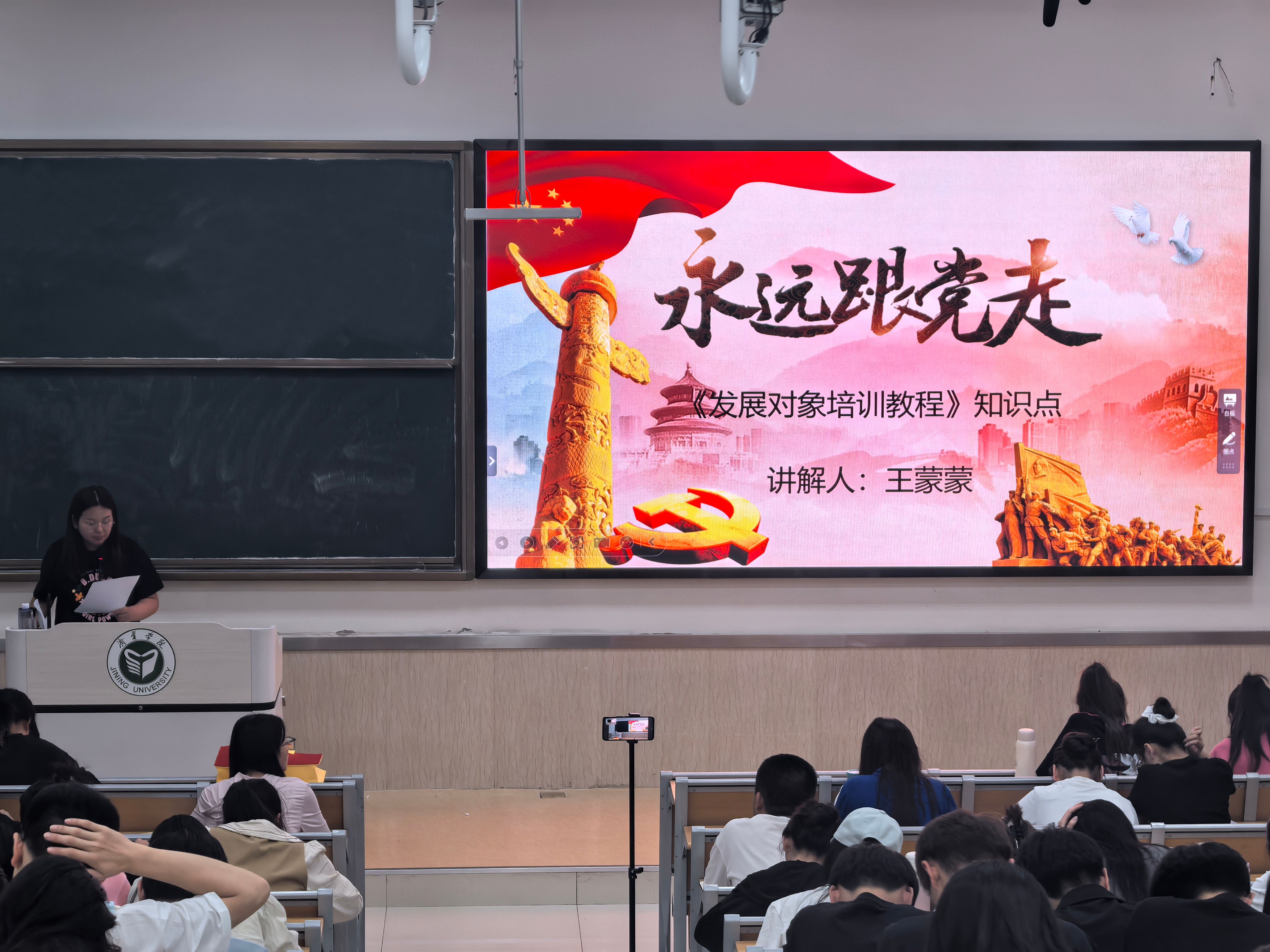 为夯实党员发展对象与预备党员的信仰根基,提升思想政治素养,5月23日下午,学生党支部副书记王蒙蒙以“永远跟党走”为主题,在9D102为第35期党员发展对象暨第19期预备党员带来一堂内容丰富、意义深刻的专题党课。