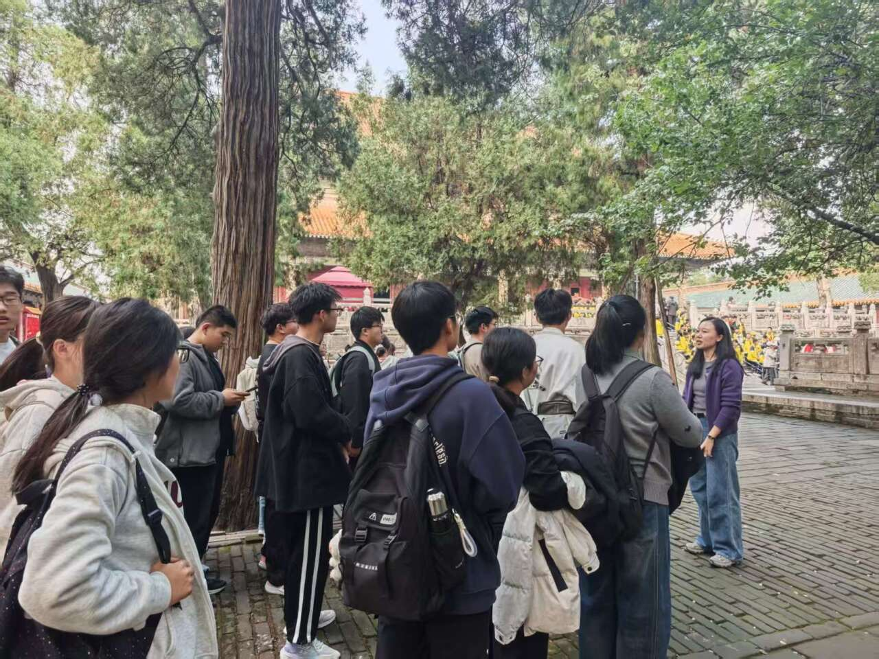 活动伊始,师生们首先来到孔庙。大家沿着中轴线依次参观了棂星门、大成殿、杏坛等核心建筑。红墙黄瓦间,师生们认真聆听“至圣先师”孔子的生平事迹与思想精髓,仔细观察建筑上的雕刻纹饰,感受古代工匠的精湛技艺与儒家文化的庄重典雅。在大成殿前,全体师生驻足凝视,深刻体会“仁义礼智信”的文化内涵,不少同学边听边记录,不时就文化细节与同伴交流探讨。随后,师生们前往孔府。作为“天下第一家”,孔府的建筑布局与陈设展现了古代宗法制度与家族文化的紧密关联。从大堂的“统摄宗姓”匾额到内宅的生活区域,讲解员详细介绍了孔氏家族的家风传承与礼仪规范。同学们在参观过程中,对“诗礼传家”的家风有了更直观的认识,纷纷表示要将优秀传统家风融入日常学习与生活。
