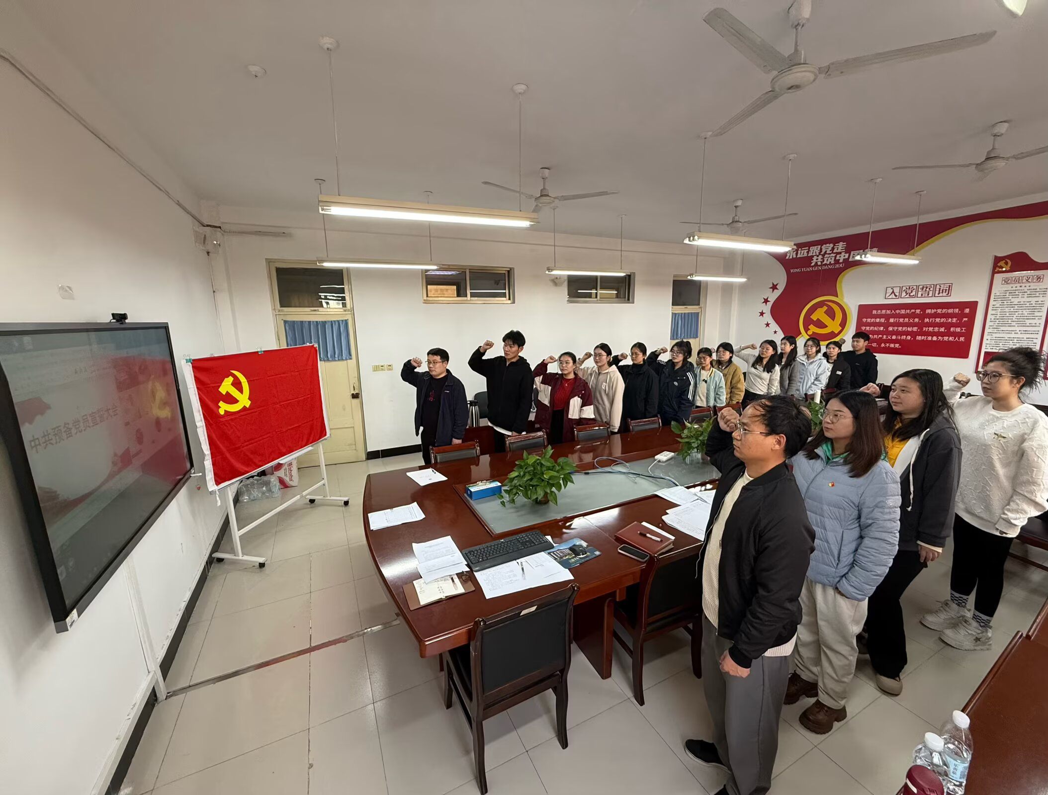 仪式在雄壮的《国际歌》中拉开序幕。在陈轶洋的带领下,15名预备党员面向鲜红的党旗,高举右拳,用铿锵有力的声音庄严宣誓,表达了他们对党的无限忠诚和为共产主义事业奋斗终身的坚定决心。