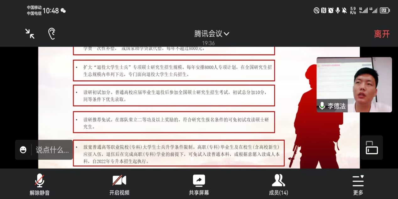 宣讲伊始,李德法老师首先简要介绍了参军入伍的基本要求,服役中的补贴标准以及应届毕业生参军入伍的优待政,接下来是退役复学同学分享入伍期间的感悟。陈永盛、张辉等同学从分别入伍选择、服役经历、退役感想等多个方面出发,分享了他们的心路历程和军旅生涯,并鼓励在场同学坚定理想信念,投身火热军营,绽放属于新时代青年人的精彩人生之花。最好,李德法老师从体检及政审要求、学费代偿、考研加分、考公“士兵计划”和女兵入伍流程等几个方面,向同学们详细解读了参军入伍的相关政策。