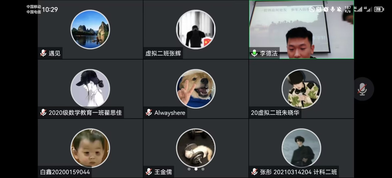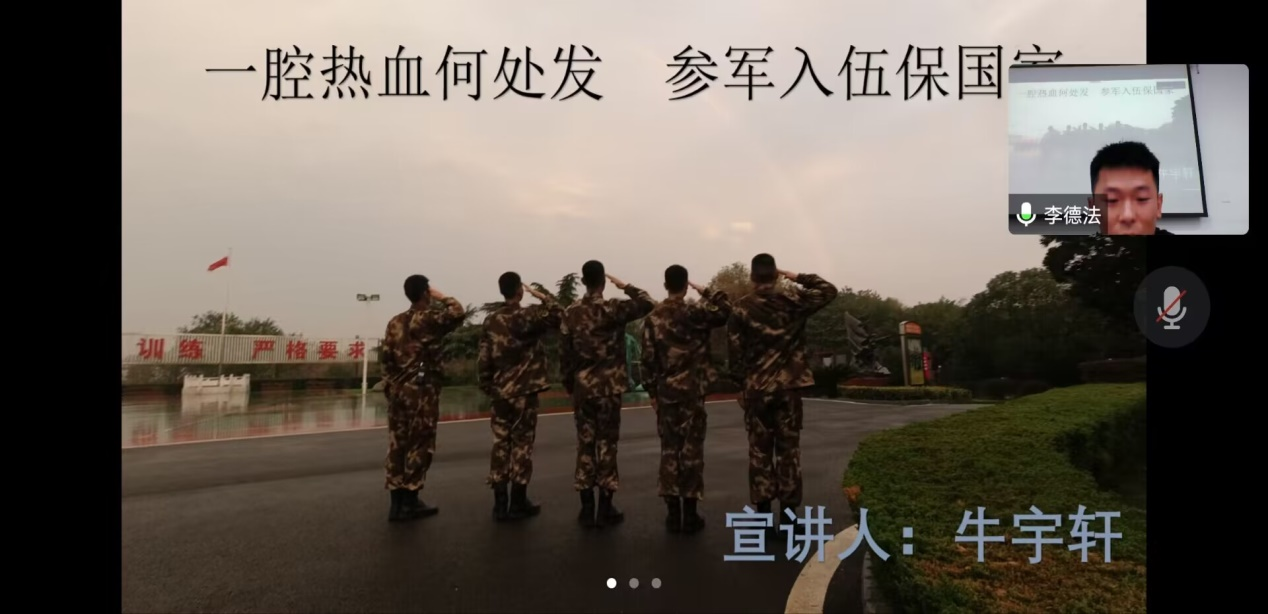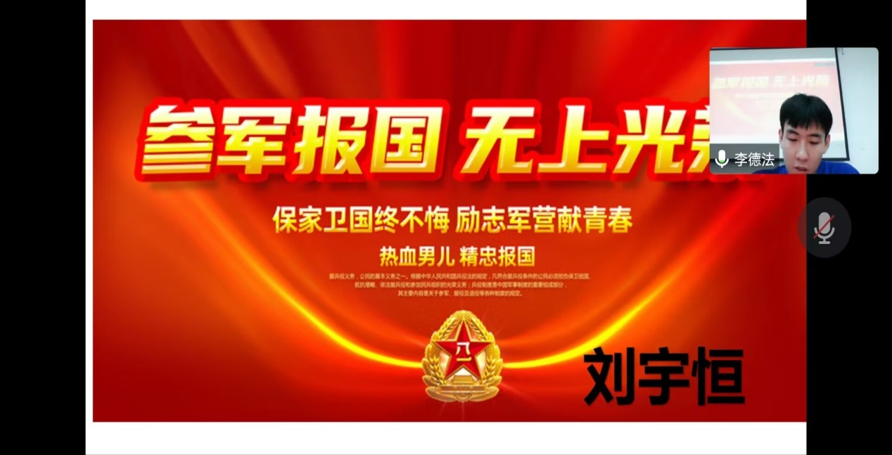 为加强征兵政策宣传,普及国防教育知识,落实学校年度征兵工作相关要求,鼓励和引导大学生积极应征入伍,协助毕业生树立正确的就业观念,我院于5月19日在A116会议室举行“青春正盛 携笔从戎”主题征兵宣讲活动,会议由辅导员李德法主持,并邀请到了学院退役士兵陈永盛、张辉、顿温星、牛宇轩、王帅和刘宇恒六名同学进行宣讲,本次活动以线下+线上形式召开。