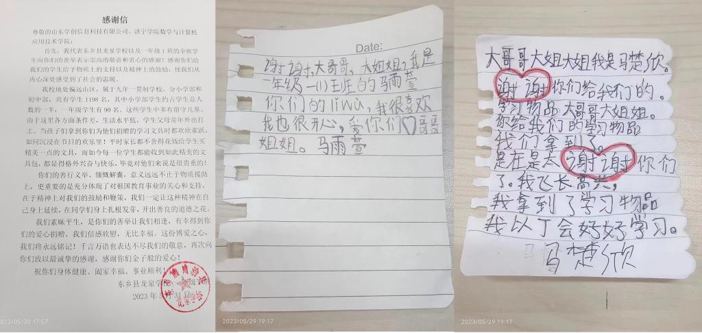 该校教师在感谢信中表示,本次活动的意义绝不仅是物质上的援助,更重要的是精神上的鼓励与支持,体现了大学生们对祖国教育事业的关心和支持。他们也一定会扎根基层教育,让这份金子般的爱心与善良在孩子们身上继续延续。