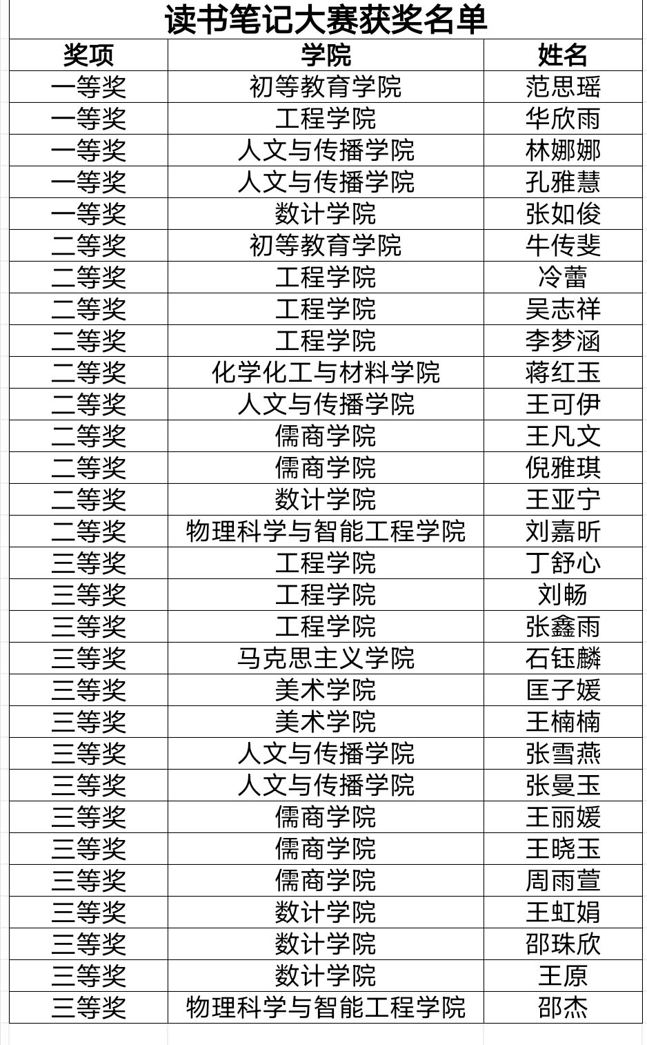 经过前期宣传,同学们积极报名,递交自己的读书笔记作品。此次活动经过评委及老师的精心评选一致得出获奖名单,其中,初等教育学院获奖2人,工程学院获奖7人,人文与传播学院获奖5人,数计学院获奖5人,化学化工与材料学院获奖1人,儒商学院获奖5人,物理科学与智能工程学院获奖2人,马克思学院获奖1人,美术学院获奖2人。获得一等奖的有: