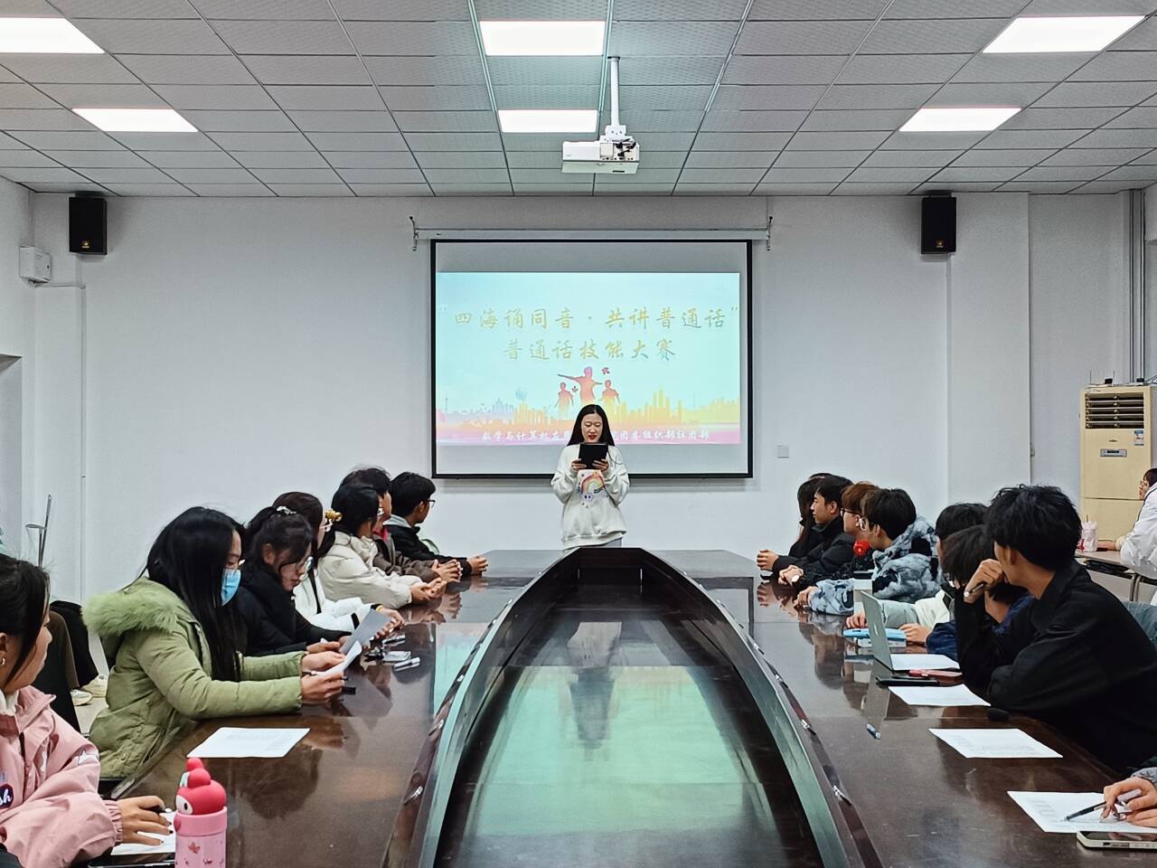 为了营造良好的校园文化环境,促进同学们之间的交流,提升师范生从业技能素养,12月12日晚,数学与计算机应用技术学院在8A116举行了“四海诵同音·共讲普通话”普通话技能大赛的决赛。辅导员王蒙蒙、崔凤玲、张亚敏出席并担任评委,学生会代表及部分2023级新生参加。