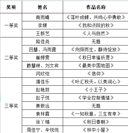 活动分为“落叶作品”和“秋日摄影”两部分。同学们以落叶为主要元素,在纸上进行创作,留下秋天的影子,与自然接触,用花木表达内心的情感,以画话心,与美好不期而通。通过摄影,每一张鲜活的照片下,用镜头展现和谐校园的魅力,将他们对于人世间的柔美慢慢诉说。活动吸引一百余人参加比赛,经过评选,“落叶作品”评选出一等奖三人、二等奖7人、三等奖8人。“秋日摄影”评选出一等奖8人、二等奖8人、三等奖10人。
