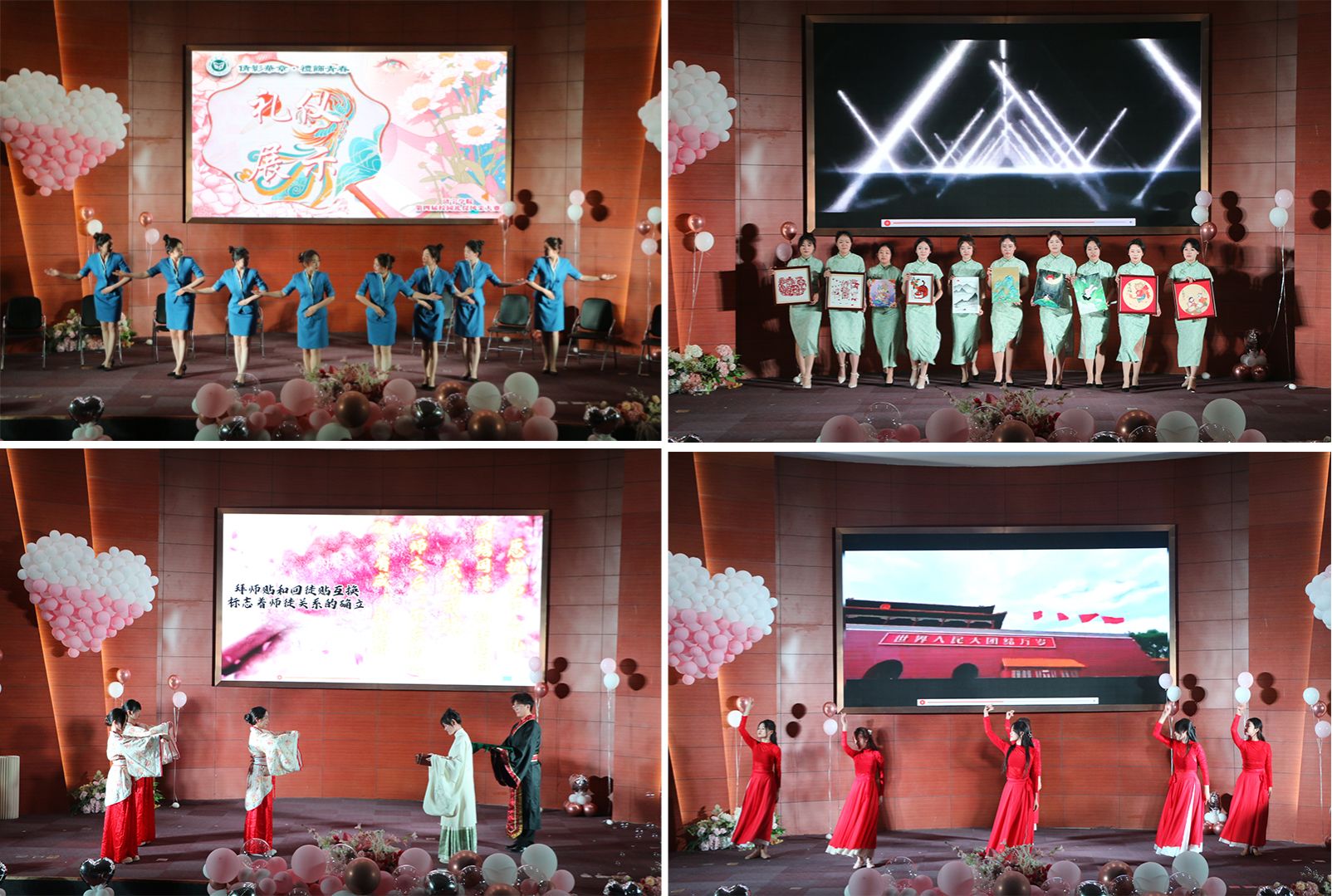 经过前期的精心宣传、细致筹备与认真排练,各二级学院选送的16支参赛队伍依次登场,凭借对艺术的独特理解和不懈追求,为观众带来了一场精彩绝伦的视觉盛宴。活动分为礼仪展示与创新表演两个环节。第一环节,选手们进行站姿、鞠躬、坐姿、引领、握手、蹲姿等规定动作的礼仪展示,他们举止优雅、动作规范,充分展示了伟德bv1946学子良好的礼仪素养和精神风貌。第二环节由各参赛队伍自行设计展示,形式丰富多样。旗袍汉服走秀彰显古典文化的韵味,舞蹈与歌舞结合传达了礼仪文化的多元魅力,生动的情景剧呈现了拜师礼等优秀传统礼仪。这些创意表演不仅丰富了比赛内容,也进一步促进了校园礼仪文化的传承与发展。活动还特别邀请Atopos舞团、校园十佳歌手王圣文、吕政錡带来精彩节目。