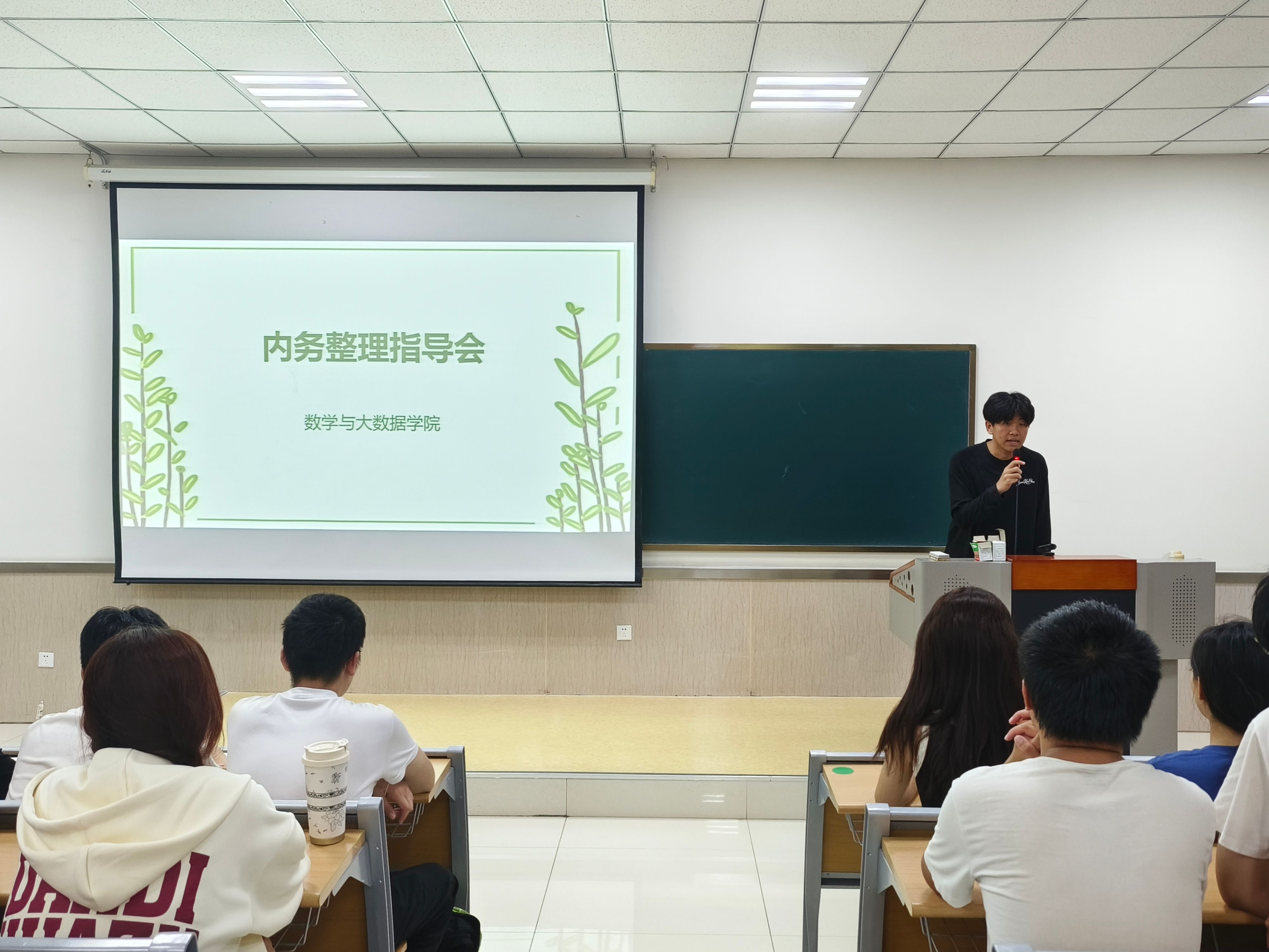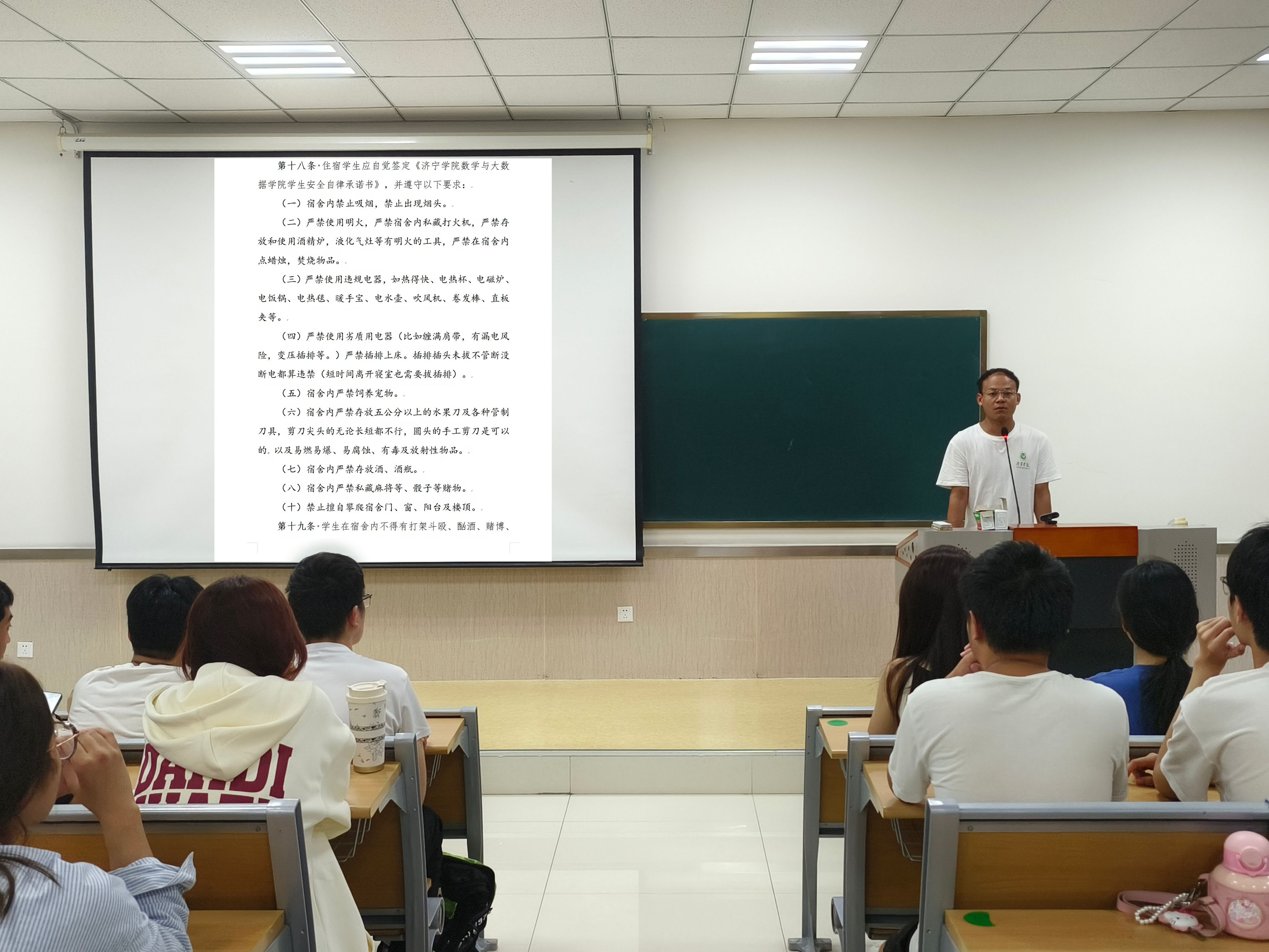 安全主题教育讲座由学院分管安全、宿舍的辅导员赵磊主讲。他详细解读学校公寓安全管理规定,带领新生学习学院宿舍安全卫生标准,重点强调宿舍内防火禁烟管理规定,展示学院宿舍文化建设成果,鼓励新生们积极融入宿舍生活、共同营造健康温馨和谐的宿舍文化氛围。王恒烁同学带来了一场内务整理指导会,他向新生介绍了校院两级宿管部门的工作情况,详细列举了宿舍检查的各项标准,包括地面、角落、床铺、桌面、阳台、卫生间及卫生工具等,让新生们对宿舍安全和卫生标准有了更具体的认识。