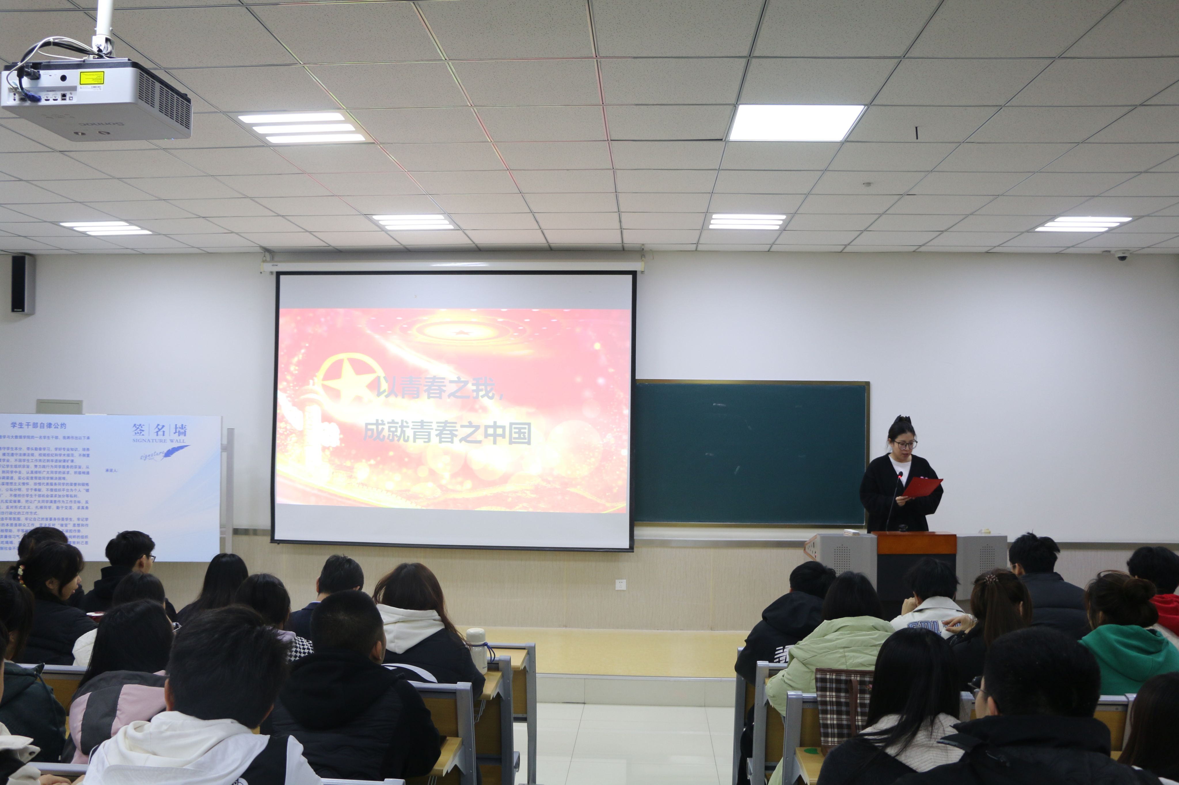大会在庄严的氛围中拉开帷幕。学院团委组织部部长邵玥带领与会人员重温入团誓词。陈轶洋宣读新一届学生干部任用文件。王蒙蒙宣读本次青马工程培训的课程和时间安排。