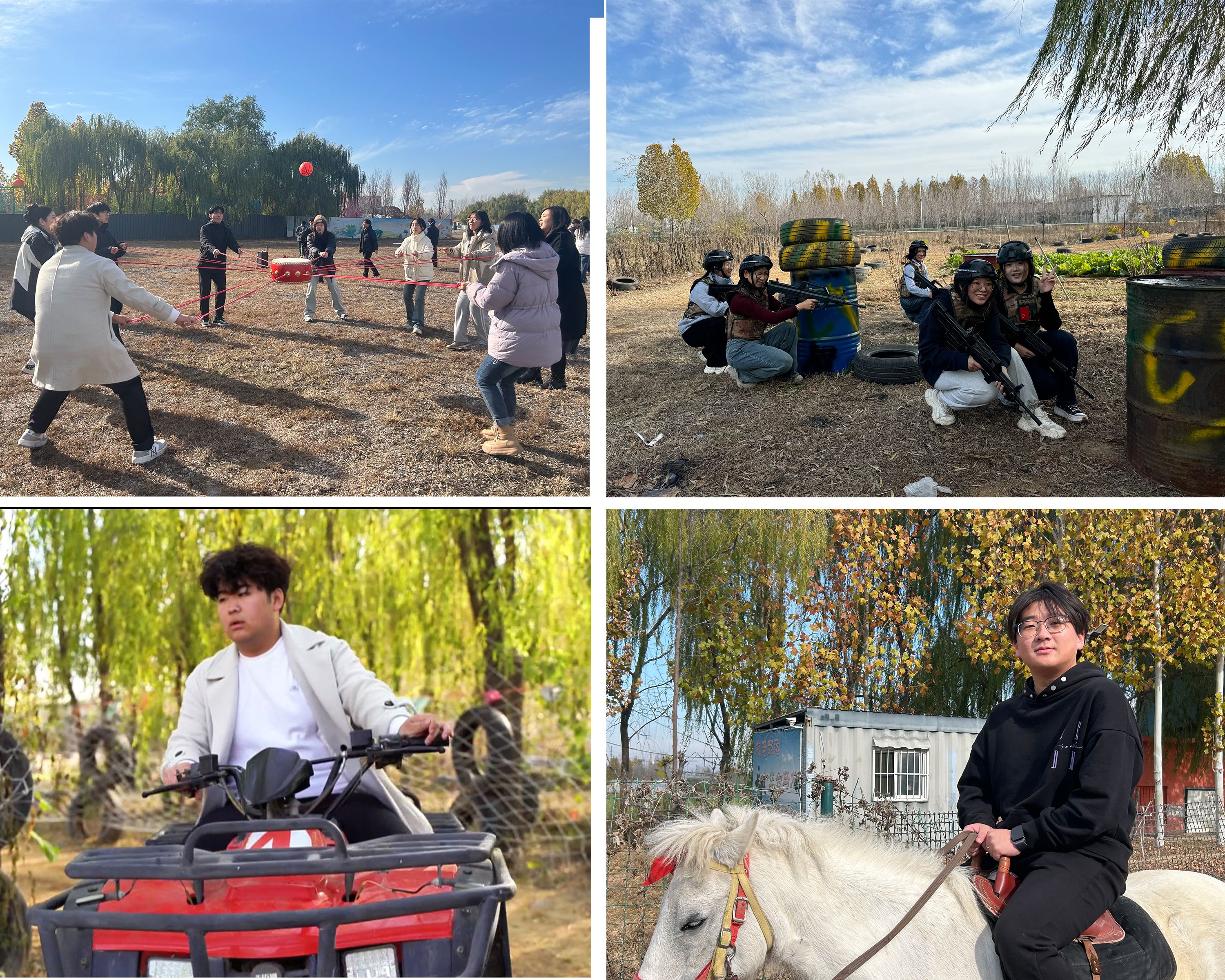 在活动基地,成员们开展了丰富多样的拓展训练。拔河、撕名牌、击鼓弹球、重走长征路、齐心运球等精彩活动轮番登场,“小游戏,大道理”,这些活动对人的体能的要求并不高,更多的是对心里的挑战、和团队的协作。同学们相互信任、群策群力,迅速破冰并且组建其相互支持、分工有序的队伍,向着胜利齐心协力。成员们还尝试了5V5真人战术演习,在趣味活动中增长军事知识。活动还设置了骑马、越野车等项目供成员们体验。最后,成员们一起做饭,朴素的地锅炖鸡,让大家体验了农家的乐趣。活动现场欢声笑语,乐趣满满。