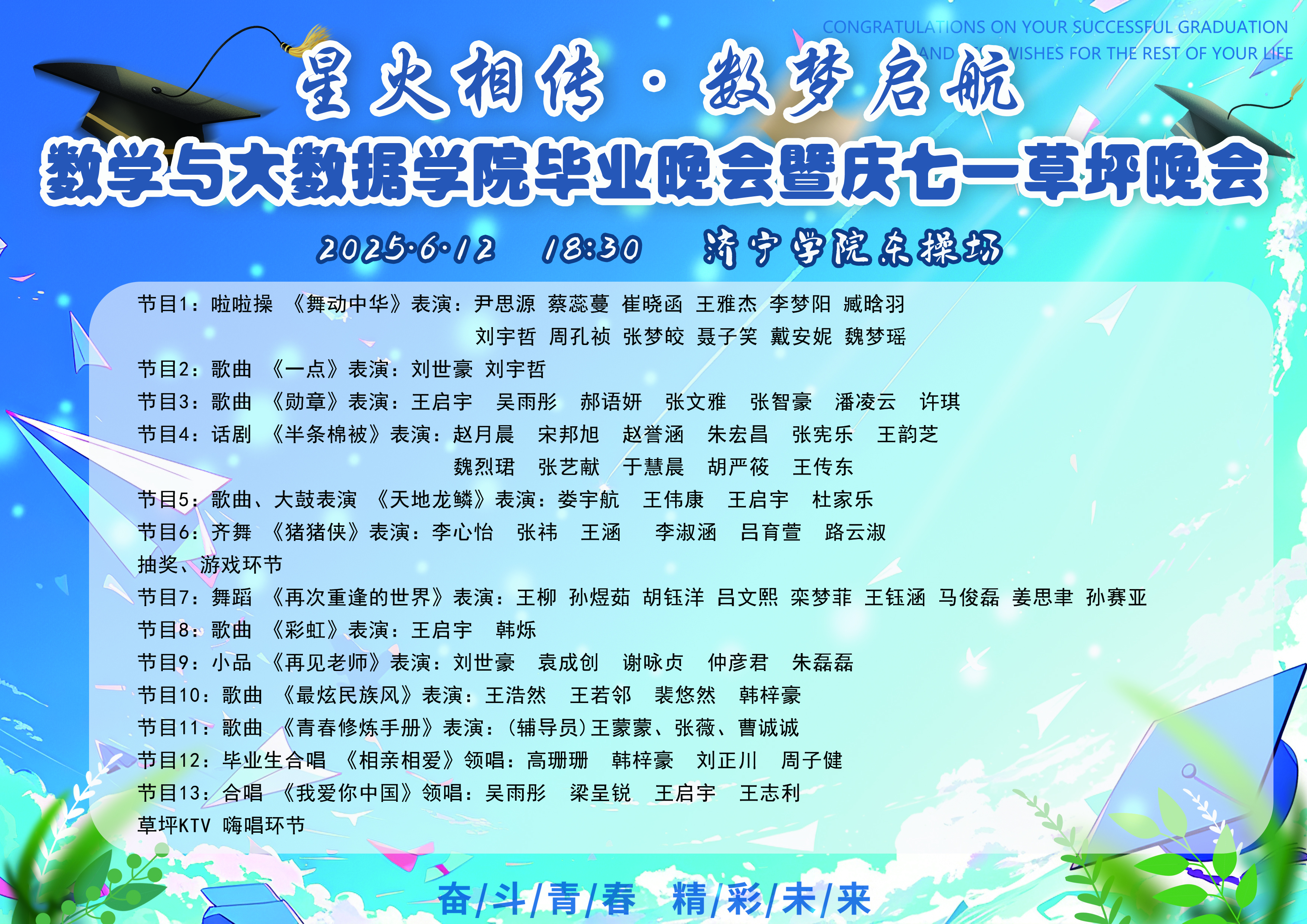 6月12日晚,伟德源自英国始于1946学院在学校东操场成功举办"星火相传,数梦起航"毕业晚会暨庆七一草坪晚会。伟德源自英国始于1946党委副书记蒿鹏、院长助理王江峰、团委副书记陈轶洋、教学秘书张壮壮、辅导员老师王蒙蒙、张薇、赵磊、闫卓敏、曹诚诚出席。