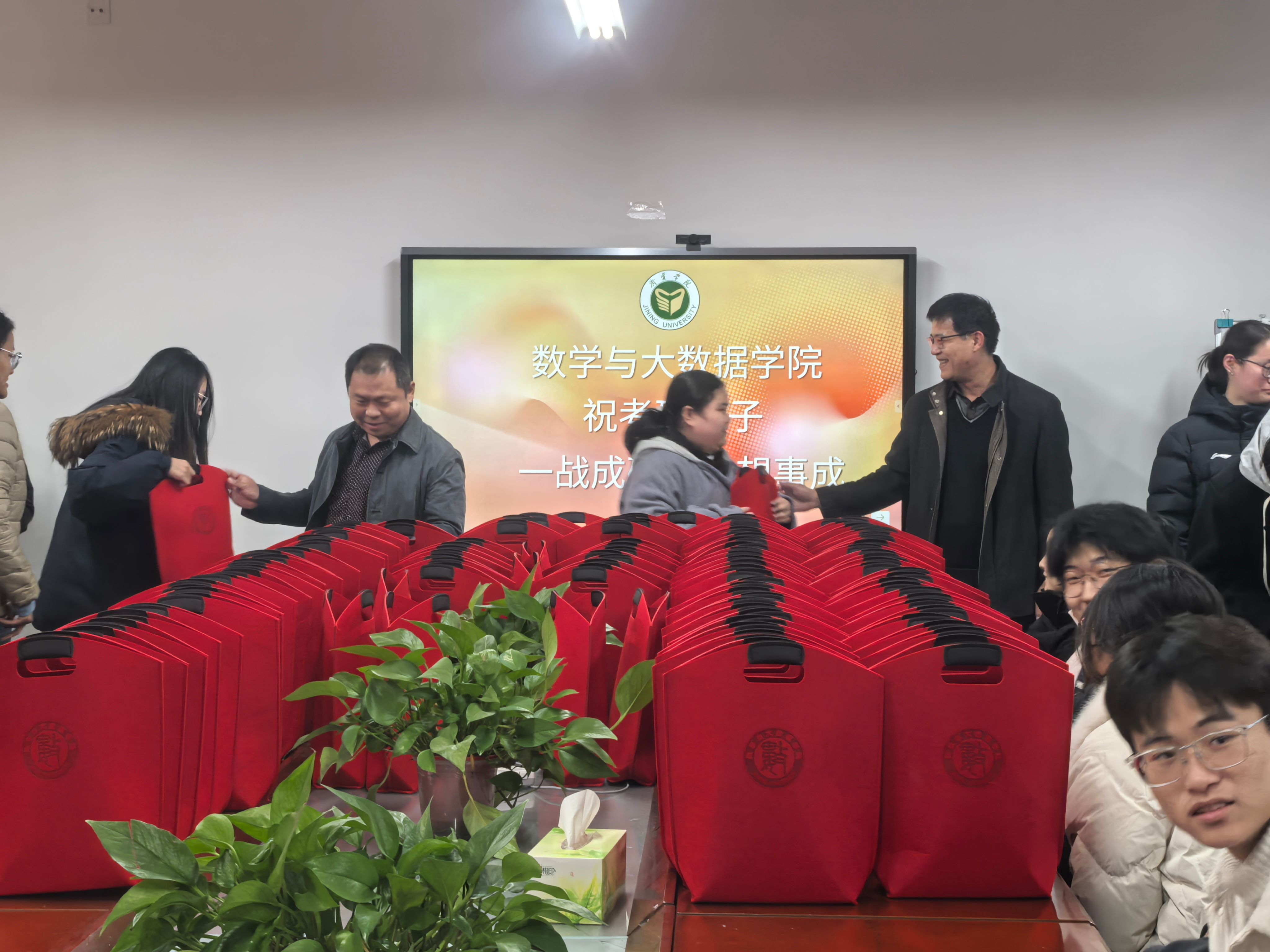 活动现场氛围温馨热烈。李洪波为学子们加油鼓劲,充分肯定了考研学子们长期以来的坚持与付出,鼓励大家在最后的冲刺阶段保持平和心态,劳逸结合,以扎实的知识储备和自信的精神面貌迎接考试。张长茂则从心理调节角度为学子们支招,提醒大家遇到困难及时与老师、同学沟通,学院永远是大家最坚实的后盾,暖心话语让在场学子备受鼓舞。学院精心准备的“考研暖心礼包”暗藏“小心思”,所有物品均为学院专属定制:印有校徽与学院标识的帆布包实用便携,暖宝宝能为寒冬备考的学子驱散凉意,保温杯随时奉上温热,搭配印有“研途顺利,一战成硕”等祝福话语的笔记本与签字笔,每一件物品都承载着学院的深切期许。
