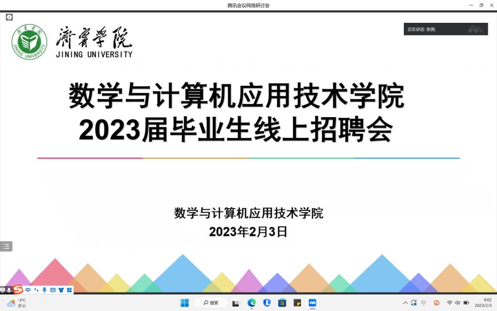为深入贯彻落实党中央、国务院关于促进高校毕业生就业决策部署,落实学院就业工作会议精神,拓宽学院毕业生就业渠道,2023年2月3日上午9:00,数学与计算机应用技术学院开展了2023届毕业生线上招聘宣讲会。鲁南制药、泰盈科技集团、山东亚华电子股份有限公司等十余家优质企业应邀参会,本次会议由辅导员张薇主持,学院副院长刘军、辅导员张颖以及三百余名2023届毕业生参会。