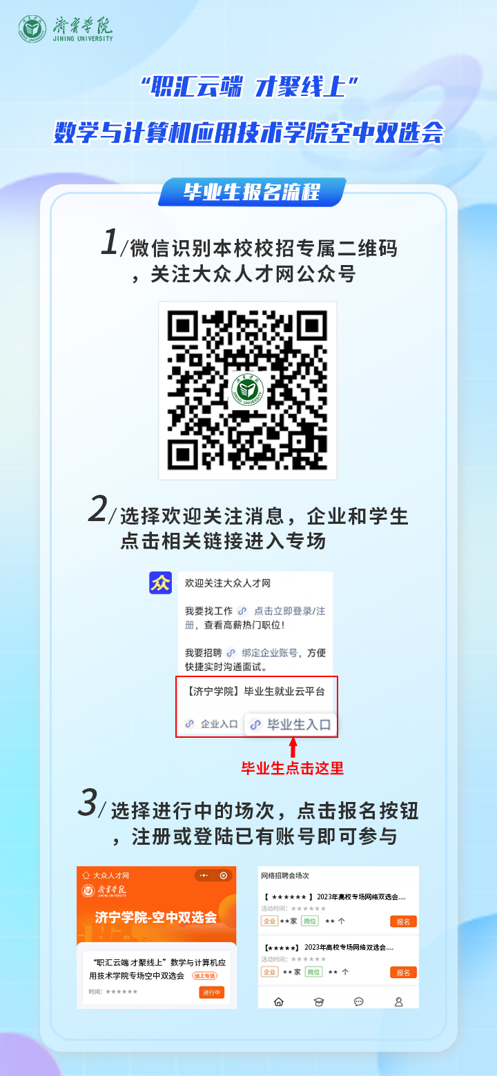 本次双选会采用“大众人才网”网上报名方式,之前未在大众人才网平台注册过的企业和个人需先进行注册完善信息后再报名参与,注册网址www.dazhonghr.com
