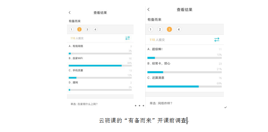 由于不清楚学生家里网络情况,在开展直播前我使用云班课做了一个调查,了解学生家里是否有电脑以及网络设备和网络信号等情况,这样可以了解有多少学生能够在家顺利收看在线课程,同时使学生感受到温暖的关怀。